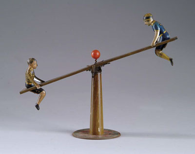 MECH. SEE-SAW TOY. USA. By Ranger Prods? Lift center knob and all tin see-saw rocks back and forth. SIZE: 14″ l. CONDITION: Good and working. 1-1989 WP (75-150)