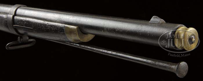 RARE RICHMOND ARMORY RIFLE. Cal .58. 33″ bbl. Among the rarest Richmond products are the 33″ bbl rifles made in 1864. Most of the Richmond Armory’s production was in rifled muskets and then in carbines. All known surviving 33″ rifles we know of are dated 1864, as is this, and this appears to be a fine, all orig example in condition that would be difficult to upgrade. All parts appear orig to this gun and most parts appear Confederate in manufacture though there is an inspector letter “A” stamped onto trigger guard which could have come “old parts” that are referred to in delivery of rifles from the Richmond Armory in 1864 as cited by Murphy & Madaus on pg 604 in their text “Confederate Rifles and Muskets.” This gun conforms to other known rifles being 48-1/2″ overall, brass nose cap & buttplate, two flat bands with “U” and the lock with typical markings “CS / RICHMOND VA” and “1864”. PROVENANCE: Ben Michel. CONDITION: Metal overall is brown, uncleaned, smooth with scattered areas of pitting. There are no discernible bbl markings though lock markings are crisp & fine. The pinched front sight unique to this maker is present. The 33″ ramrod with this gun appears orig to rifle’s use though it was altered from an earlier style musket rod and properly treated. The rear sight has both leafs replaced though sight base appears orig. Brass buttplate & nosecap have yellow mustard patina and are well fit. The stock is sound & solid with good red color. The stock is burned & eroded in about a 1/2″ area behind bolster from use. Rifling in bore is discernible though rusted overall. 4-45747 JS54 (8,000-12,000)
