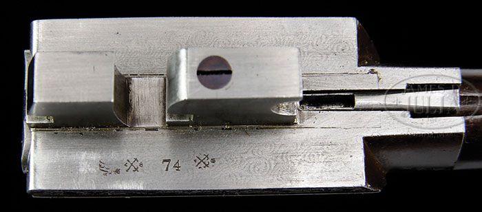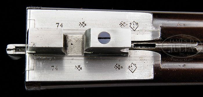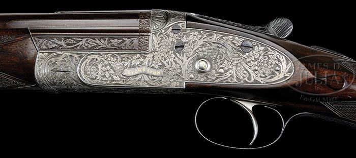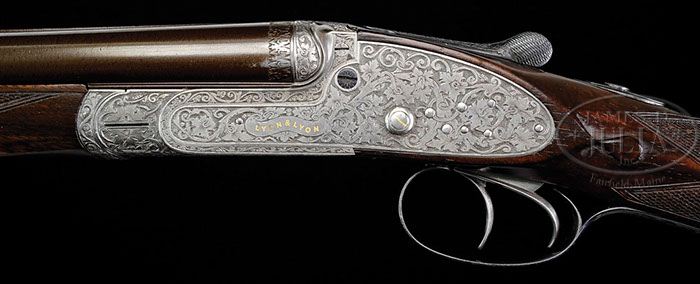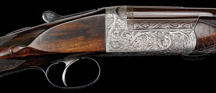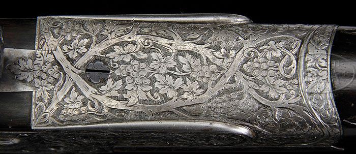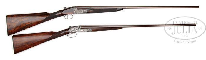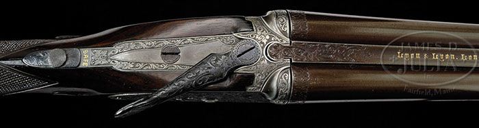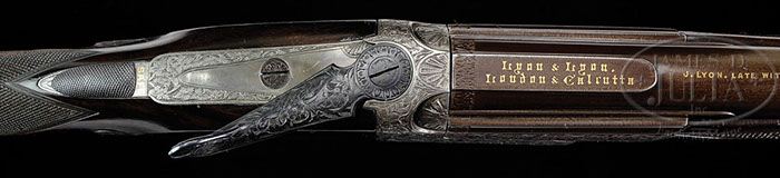 INCREDIBLE CASED SET OF .410 LYON & LYON SIDELOCK GUNS COMPLETED FOR THE MAHARANEE OF DHOLPUR. SN 607/ 608. Cal. .410 Double/ .410 Single. 2″ Chambers. Double with 27″ fine Damascus bbls has concave game rib with dolls head extension, gold inlaid “Lyon & Lyon. London & Calcutta.” “J. Lyon. Late with Jas Purdey & Sons. London”. Bbl flats are stamped with Birmingham black powder proofs. Diminutive, case hardened, sidelock, top lever action features automatic safety (SAFE inlaid in gold), double triggers, and automatic ejectors. Fences are nicely filed in serpentine form. Bar action sidelocks have raised tumbler pivot bosses, tumbler ends gold inlaid with band as cocking indicators. Action and locks are engraved in an unusual pattern of semi-relief large open scrolling vines with acanthus and scroll tendrils. “Lyon & Lyon” is gold inlaid on scrolled riband on each side. Blued top lever and trigger guard continue the theme. SN is on long trigger guard tang. Nicely streaked European walnut straight grip buttstock measures 14″ over checkered hard rubber buttplate, and features classic drop points, flat top point pattern checkering with mullered borders, and a large vacant gold shield on toe line. Splinter ejector forend has inset hard rubber tip and Deeley latch. Bore diameter at muzzles: left -.407, right -.403. Wall thickness: left -.038, right -.038. Drop at heel: 2-3/16″, drop at comb: 1-3/8″. Weight: 4 lbs. 8 oz, LOP 14″. Single bbl .410 is 29″ Damascus with heavy breech and Rigby flats, top flat isgold inlaid with Lyon & Lyon address. Top of bbl is gold inlaid “J. Lyon. Late with Jas Purdey & Sons. London.” Bbl flats are stamped with Birmingham nitro proofs for 74 bore. Very unusual back action sidelock single shot action (built to match double gun with respect to features), differs only in that engraving is obviously of grape vines highlighted with bunches of grapes and leaves. Stock is more heavily marbled, and matches other gun as to features. Ejector forend with Deeley release, has slightly schnabeled horn tip. Bore diameter at muzzle: .401 Wall thickness: .055. Drop at heel: 2″, drop at comb: 1-7/16″. Weight: 4 lbs. 8-1/2 oz, LOP 14-1/8″. Oak and crocodile leather case with nickel-plated brass corners is embossed in gold “Her Highness Maharanee of Dholpur”. Upper left corner of case is embossed “Cale. 410 no 607″ ” ” 410 no 608″ “Charge 2 Inch Paper Case Powder 3/4 Drs. C & H No 6” “Shot 3/8 Oz No 8”. Case is lined in burgundy velvet with space for both guns and a large number of accessories, including: steel Davis type round ball mold marked “410” and “For Right Barrel Only” “607” “608”. Also included are a 3-pc ebony and German silver cleaning rod with jag, and 410 loading tools including nickel-plated lever type capper and decapper horn handled lever housed in its own compartment, a nickel-plated 410 roll crimping tool with horn handle, powder loading funnel, priming block, and wad punch stamped “410” and “Steel”. Also included are round glass pewter topped oil bottle and plated cover for chamber brush. CONDITION: Excellent, as partially refinished. Both guns are essentially inthe same condition with bbls nicely re-browned with fair definition to Damascus pattern, and retaining 95% of that brown, silvering slightly at breech ends. Actions retain most of their orig light case hardening color, almost a French grey. Stocks retain most of an oil refinish, edges slightly rounded, checkering freshened and is missing a number of diamonds especially on double gun. Bores are excellent, bright and shiny throughout. Actions are tight. Bbls are on face. Ejectors are in time on double, and strong on single. Case is very fine, leather with considerable marks and scuffs, embossing is losing its gold. Interior cloth has considerable marking and soiling with some areas rubbed through cloth on lid. Accessories are very fine to excellent, except that one joint of cleaning rod is broken. Mold is somewhat pitted, handles cleaned. Sidelock 410 guns are exceptionally scarce, and guns of this vintage and quality are almost unheard of. 4-46786 MGM224 (25,000-35,000)