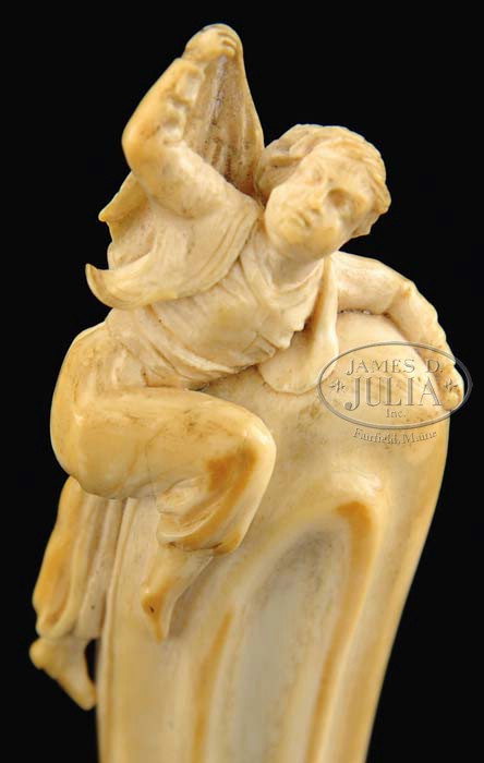 OUTSTANDING, IMPORTANT & MOST HISTORIC DELUXE CASED PRESENTATION BOWIE KNIFE. Fabulouis Hassam Bros. of Boston Bowie knife with 8-1/4″ clip point blade, 13-1/2″ overall with flat ground, beautifully polished blade that is 3/4″ wide on the ricasso and 1/4″ thick. Hand guard is elliptical shaped silver 1/8″ thick with spectacular eagle’s head quillions facing in opposite directions with a fine integral band that has raised engraved bead and a spectacular carved ivory handle. Handle is carved in a slightly bent position to accommodate the hand, with raised ribs on each side and a spectacular integral carved pommel of a sailor climbing an obstacle with the American flag over his right shoulder and a Bowie knife in his left hand. Back of grip, near the handguard has a raised carved facsimile of the Massachusetts State Seal. This knife is undoubtedly the product of Hassam Bros. Knife Works of Boston. Accompanied by its orig purple velvet covered sheath with silver tip & throat that has a shield shaped frog stud. The back side of the silver throat is engraved in block letters “COL. THOS. G. STEVENSON, ” and the front side of the throat is beautifully engraved in period script “of / New England Guard Regiment, / from his / Boston Friends.” The frog stud on back side is in the shape of a shield engraved in Olde English “NEG” which stands for the New England Guard. This fantastic knife is accompanied by its orig black leatherette covered, purple satin & velvet lined wooden case. Thomas Greeley Stevenson was born in Boston Feb. 3, 1836 to a well-to-do family of Boston business men with a well-connected mother. His education was in Boston common schools and the public Latin school, after which he was employed at the Boston & Lowell Railroad Company. In 1861 when it became apparent that war with the south was eminent the New England Guard, which had been organized in 1812, volunteered for service. At that time Thomas G. Stevenson was the 1st Sergeant of Company A of that Unit and was then elected Captain of the newly formed Company B. In late April of that year Fort Independence in Boston Harbor was guarded only by an Ordnance Sergeant. Unwilling to allow the fort to remain in an unprotected state the 4th Batallion, including Capt. Stevenson’s Company, was asked to man the Fort, unpaid, with rations furnished by the State. The Batallion occupied the fort and Capt. Stevenson, as senior officer was in command. On 4 May he was unanimously elected Major. On the 25th of May the Batallion was relieved and returned to Boston. Major Stevenson and Capt. Osborne, the Commander of Company A, appealed to the Governor and offered their services as Officers of Volunteers. The Governor quickly commissioned Maj. Stevenson Colonel and Capt. Osborne Lt. Colonel and both were later assigned to the 24th Regiment of Massachusetts Volunteers. Col. Stevenson later was promoted to Brig. General and fought in a number of battles up & down the east coast and was killed May 10th, 1864 while in command of the 1st Division 9th Army Corps at Spottsylvania, Virginia. This therefore accurately dates the presentation of this knife between Dec. 3rd, 1861 when he was commissioned Colonel & Dec. 24, 1862 when he was appointed Brig. General. This knife appears in full color on p. 21 with a full description, on p. 20 of The Antique Bowie Knife Book, Adams, Voyles & Moss and on pp. 338&339 of The Bowie Knife Unsheathing an American Legend, Flayderman. CONDITION: Extremely fine. The blade, slightly tipped retains much of its orig polish with a few very light freckles of surface spotting. Handguard is extremely fine with good detail on both quillions. Handle has a crack down the back from the handguard to the soldier on the pommel, otherwise is sound and intact retaining a wonderful mellow ivory patina. Sheath shows wear to velvet covering on top & bottom edges with a slightly open seam but is completely intact. Throat & tip are extremely fine with crisp, clear legends. Orig casing shows heavy deterioration on exterior with wood losses from the bottom and leather covering losses from the top. Silk lining in lid is moderately water stained with a small tear towards center back. Velvet lining in bottom is completely intact with very light soil. Altogether an extraordinary and historic presentation Bowie knife to a heroic & valiant soldier of the Civil War. 4-37660 JR109 (80,000-120,000)