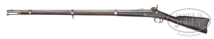 RARE 1861 HIGH HUMP RICHMOND RIFLED MUSKET. Cal .58, 40″ bbl. The first production of the Richmond Armory were guns made from existing Harper’s Ferry stock captured from Armory. This is one such gun that appears all orig & complete in this rare 1861 High-Hump Richmond State of Virginia configuration. There is a small rectangular cartouche opposite lock that is still discernible in outline and appears to have the initials “SA” in script. This is thought to stand for Solomon Adams who was the Master Armorer at the Richmond Armory. This gun appears orig & complete in every regard and conforms to other known specimens. This gun is referenced as a Type One Richmond Armory Rifled Musket according to Murphy & Madaus in their text “Confederate Rifles and Muskets.” This gun is 56″ overall with three flat brass bands. Several of these parts appear to be Confederate in manufacture including the un-surcharged iron buttplate that show striations that would never 2ould have passed U.S. inspection. The bbl also has laminated flaws typical of later Richmond bbls that never have passed U.S. inspection. The stock appears to be an 1855 stock from inventory captured at Harper’s Ferry. The bbl bands are also most likely Richmond manufacture as front 2 bands are not stamped “U” and rear band has the large centrally-stamped “U” typically found on Richmond Armory products. CONDITION: This gun is very good overall. Metal is gray overall with scattered pitting & staining. Brass nosecap has yellow mustard patina. Stock is sound & solid with numerous small nicks, gouges & scratches. The “SA” cartouche is discernible though light as can be seen in photos. There is no discernible bbl date but “VP” proofs are visible & lock markings are excellent. 4-45775 JS55 (7,000-9,000)