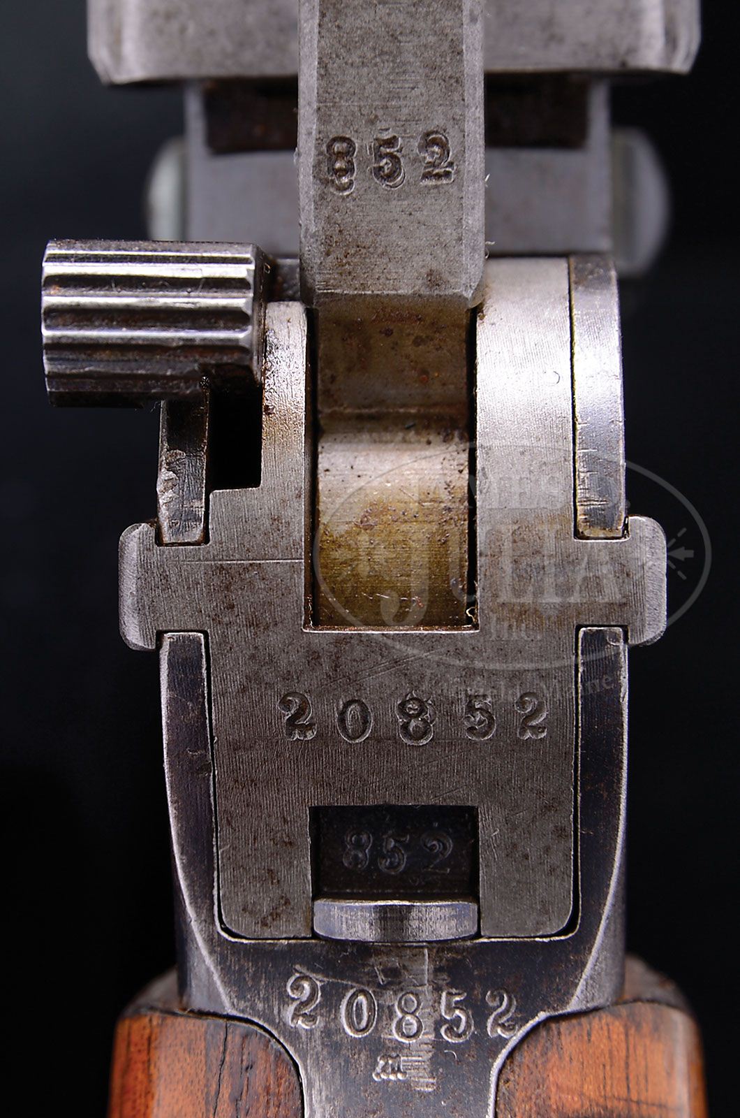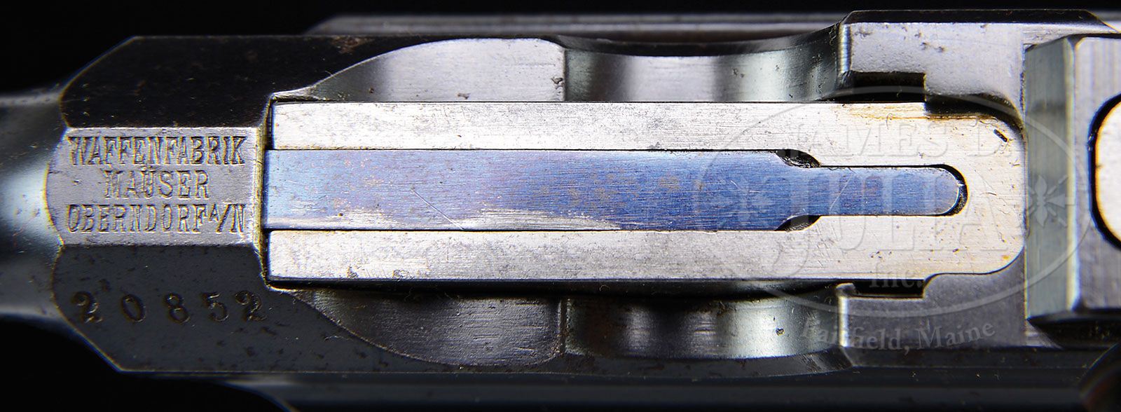 *MAUSER C96 LATE TRANSITIONAL LARGE RING HAMMER WITH MATCHING STOCK. SN 20852. Cal. 7.63mm. The late transitional C96s were likely assembled to use up the remaining Conehammer parts prior to introducing the Flatside. Production was limited, about 500 guns, most being in the range of 20,500-21,000. This example has a 5-1/2″ bbl, long extractor, slip-in 50-1000 rear sight, single lug firing pin and large ring hammer. Standard markings on chamber with full SN on left chamber flat. Crown “U” on left side of bbl extension and antler proof on right side. Matching number on bolt stop, bolt, firing pin, hammer, subframe, locking lever and frame. The sight bar and cursor are numbered “905”. Detailed disassembly shows matching follower and floorplate, in addition to locking block and all subframe components. The full SN is stamped inside each grip panel. Correct lanyard ring is present. Accompanied by matching shoulder stock whose lid has been notched for the large ring hammer. PROVENANCE: Ralph Merrill Collection CONDITION: Pistol has approx. 70% original blue with balance largely covered by oxidative freckling that is particularly pronounced under the bbl and over the mag well housing. Blue on frontstrap is thinned to a brown-gray with less advanced wear on backstrap. Conehammer trigger has only minor surface discoloration. Small parts including the extractor (that is slightly bent upwards) have about 80% of their original fire blue. Very good to excellent grips. Bore is surprisingly bright with strong rifling and minor frosting. Stock and lid have been painted. Hinge has about 40% oxidation with comparable oxidation and thinning involving the lug. (C&R). 4-47219 LMA86 (3,500-5,500)