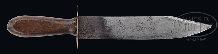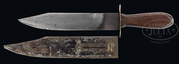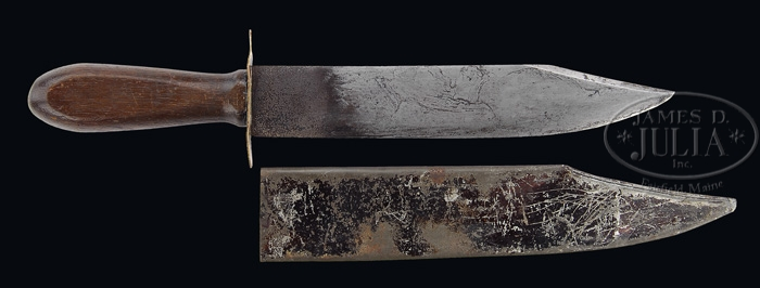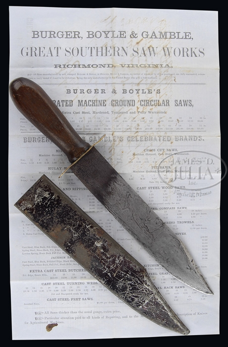 RARE BOYLE & GAMBLE MAKER MARKED BOWIE KNIFE IN ORIGINAL TIN SCABBARD. You are bidding on a beautiful 13-1/2″ overall Confederate Bowie with a 9″ clip point blade. The blade is maker marked “Boyle & Gamble/Richmond VA” but as can be seen in the photograph only the “Boyl..” of maker mark in legible, the “Richmond VA” is very nice and well struck. These knives almost never have a complete stamp. The grip is well made from a single piece of wood, typical of other Boyle & Gamble products. The 3″ brass oval cross-guard is decorated with 10 stars and two floral scrolls on either end, which I have not seen before. Boyle & Gamble knives are generally decorated with stars only. Accompanying this knife is a wonderful advertising broadside which measures approx. 10″ x 15″. This advertisement from Burger, Boyle & Gamble advertises their saws and knifes they were making just prior to the war. This broadside which served as a letter dated Nov. 25, 1859 is rare and in wonderful condition and would display wonderfully with an Burger or Boyle & Gamble product. Boyle & Gamble was a large Confederate manufacturer, however knives in fine condition are rarely offered, especially in an orig, perfect tin Japanned scabbard. It is believed to be on of the finest marked examples known. PROVENANCE: William Turner Collection. Pictured in Pritchard “Collecting the Confederacy”. Exhibited at the Civil War Center at Tredegar Armory in 2007. CONDITION: Scabbard is very good overall, retaining half of its original Japanning. Blade exhibits much of its original polish and shine with approx. 2″ area at ricasso that is rusted and pitted, scattered staining and pitting as seen in photos. Cross-guard has been cleaned, though dark brown patina is seen in protected areas including recesses of the decorating stars and scrolls. Wood grip still exhibits some original varnish with some scratches and scrapes. Broadside letter is accompanied by original envelope and stamp and is in very good condition overall with some foxing and cracks at folds. 4-35281 JS24 (15,000-20,000)