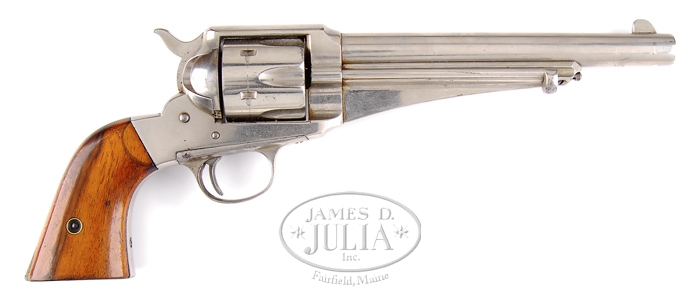 REMINGTON MODEL 1875 SINGLE ACTION REVOLVER. SN 901. Cal. 44 WCF (44-40). Nickel finish with 7-1/2″ bbl, full orig sight with usual 1-line bbl marking. It has “44” stamped on left rear web of trigger guard. Fitted with matching numbered, smooth 2-pc French walnut grips with brass escutcheons. These fine revolvers were contemporaries of the more famous Colt single action and only 25,000-30,000 of them were made in period 1875-89 making them substantially more scarce than the Colt. CONDITION: Very fine. Overall retains about all of its orig nickel finish turned slightly milky on bbl. Cylinder has a drag line, otherwise retains about all of its orig nickel. Screws retain generous amounts of their orig blue. Left side of frame is a little frosty and there is a spot of pitting on trigger guard. Grips show light wear with minor nicks & scratches with a chip missing at right heel and some battering on bottom edges, otherwise retain most of their orig varnish finish. Mechanics are fine, bright shiny bore. 4-31553 JR203 (4,000-5,000)