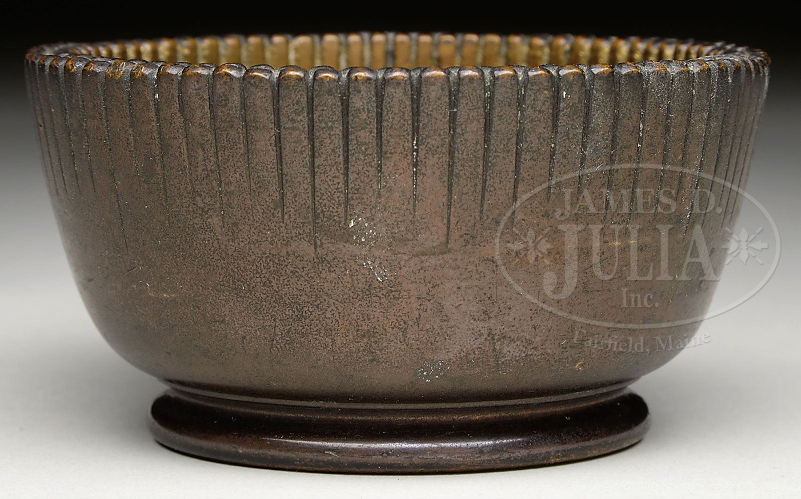 TIFFANY STUDIOS ASH TRAY. Tiffany Studios cast bronze ash tray has double beaded lip with vertical reeding extending from the lip halfway down the ash tray on both interior and exterior. Finished in a rich brown patina. Signed on the underside “Tiffany Studios New York 1709”. SIZE: 3-1/8″ dia. CONDITION: Very good to excellent with some minor discoloration to interior. 5-67179 (200-300)