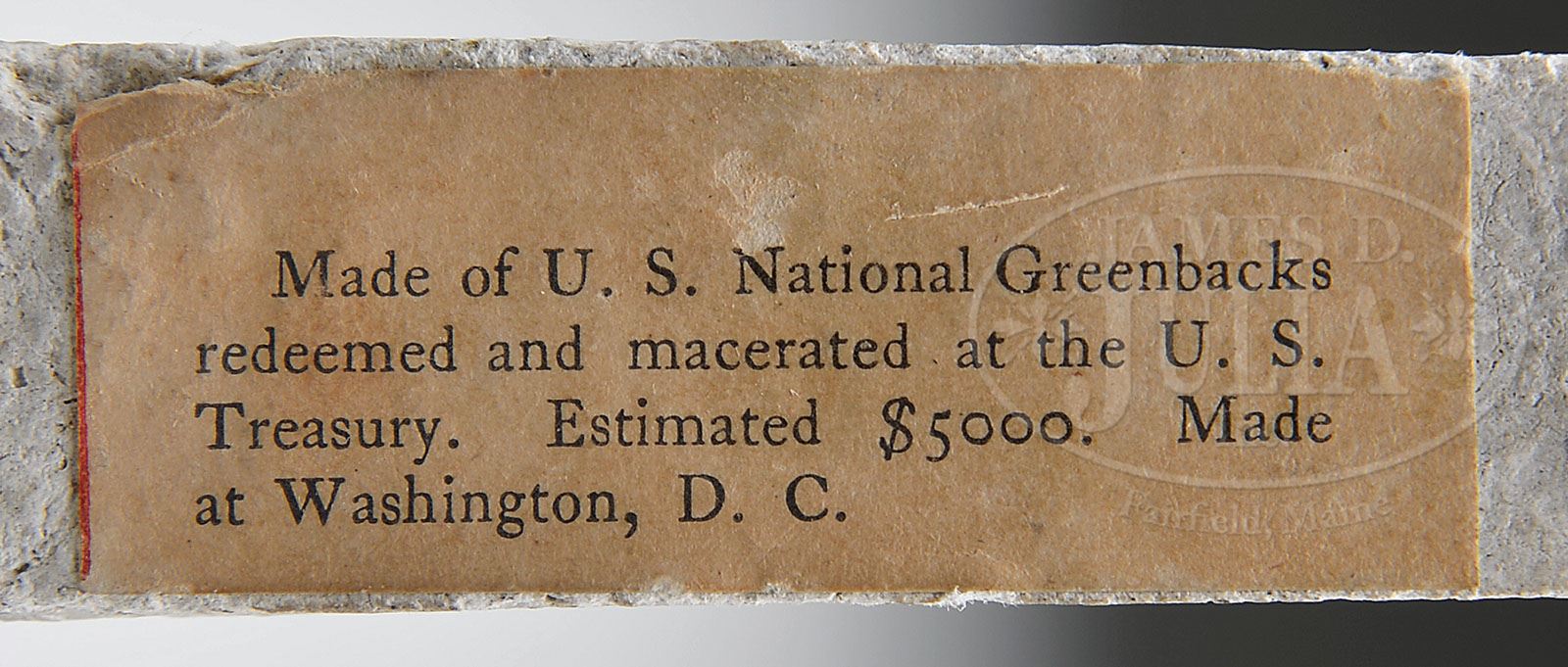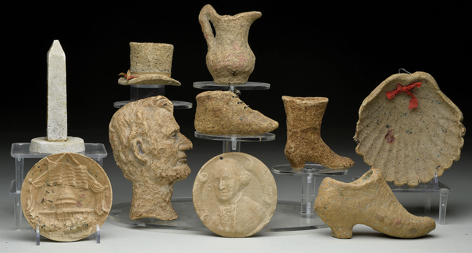 FABULOUS LOT OF FIGURAL MACERATED CURRENCY. Lot includes: 6″ Abraham Lincoln bust; 5″ high Washington Monument (with original label); 4″ diameter souvenir of Washington, DC with original raised description on reverse, the medallion showing the capitol with American flag; 4″ diameter George Washington medallion with original label; 5-1/2″ diameter shell dish with partial original label; 6″ long shoe; 4″ long shoe with partial original label; 3-1/2″ high boot with original label; 3-3/4″ pitcher; 2″ high top hat with original label and red, white, and blue ribbon. SIZE: As noted above. CONDITION: Lincoln with an old repair across neck, shell with roughness to edge, and possibly a reglued Washington Monument. Otherwise very good. 9-28410 (2,000-3,000)