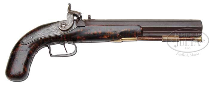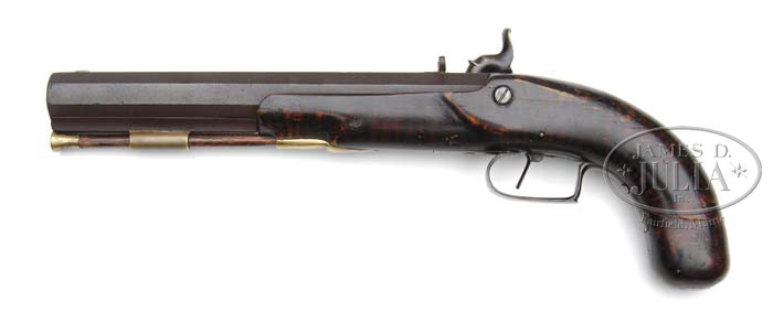 PERCUSSION PISTOL ATTRIBUTED TO ST. LOUIS MAKER ADOLPHUS MEIER. SN NSN. Adolphus Meier made percussion guns in St. Louis circa 1838 – 1868. This pistol has an 8-1/2” full oct ribbed .56 Cal. rifled bbl. and a back action percussion lock stamped “Adolphus Meier & Co.”. The pistol has an iron trigger guard and no sideplate. Stock is hand striped. St. Louis guns are quite rare and desirable. CONDITION: In addition to normal expected dings and bruises the bottom 2” of the grip has been broken and repaired. There is a hardly noticeable stress crack between the trigger guard and rear entrance ferrule. 4-42176 RG23 (3,000-5,000)