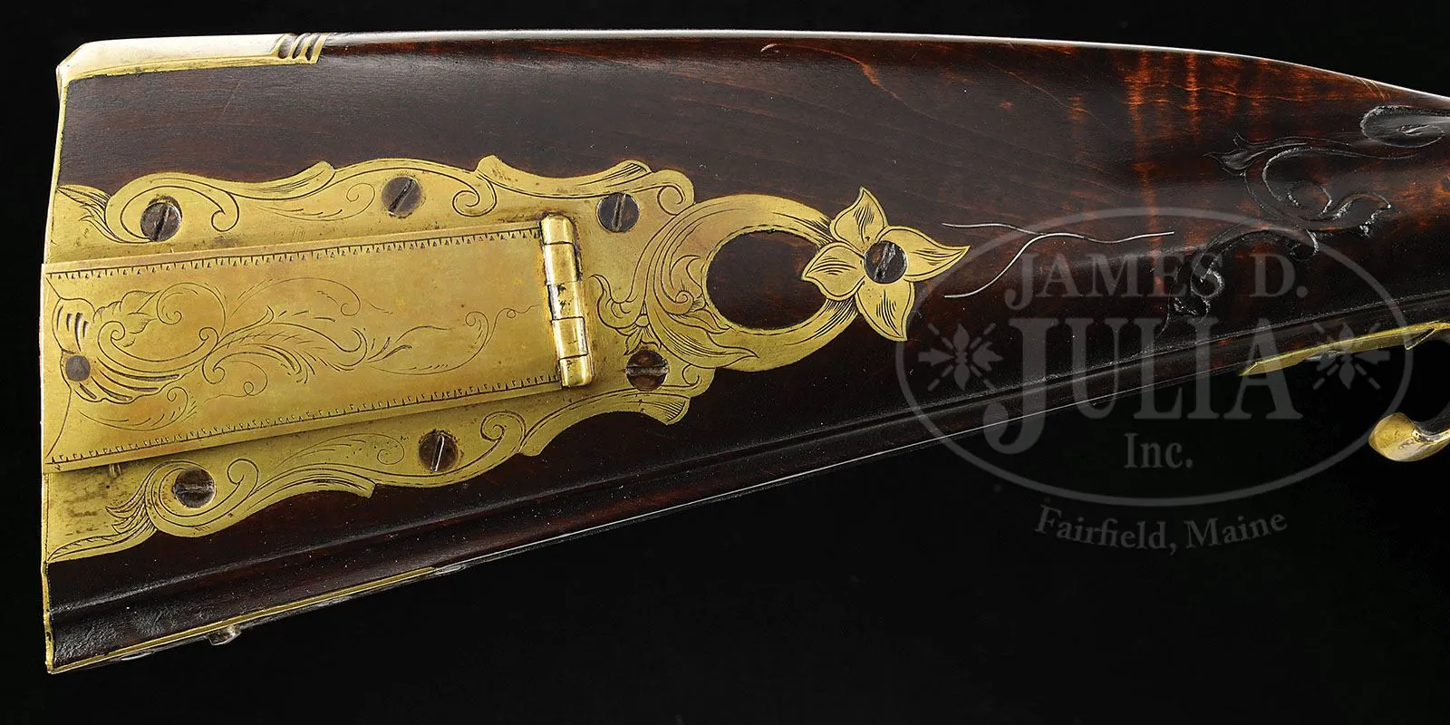 RARE CONTEMPORARY PRE-REVOLUTIONARY WAR LONG RIFLE BY MASTER GUNSMITH WALLACE B. GUSLER OF COLONIAL WILLIAMSBURG, VA. SN NSN. This masterpiece Kentucky long rifle was made in 1969 by one of the most famous contemporary long rifle makers of all time. Wallace B. Gusler was the first master gunsmith in the Colonial Williamsburg gunmaking shop beginning in 1963. Young Mr. Gusler was the star of the most watched Kentucky rifle related documentary film to date “The Gunsmith of Williamsburg” which was narrated by news anchor David Brinkley. Mr. Gusler is one of the top makers of rifles made completely by hand and has been an influence on the Williamsburg gunsmiths who followed him. This rifle features a curly maple stock. The wood blank was handcut by Wallace Gusler in Ft.Lewis, VA prior to his coming to Colonial Williamsburg. All the hardware was made in sand cast molds. Patchbox is one piece sand cast with a captured lid. Stock has 2″ wide butt as proper for the early period. Toe plate, patchbox, buttplate and sideplate are masterfully hand engraved. Stock has very fine forestock molding with fine rear entry thimble carving. Stock was stained with nitric acid and polished with a boiled linseed oil finish. The workmanship in this rifle represents the quality normally found only in the finest of orig rifles. Rifle is .50 Cal and patina is that of a period orig. This rifle was made in what is today considered the Williamsburg Shop’s Golden Age. CONDITION: As new condition. To our knowledge this is the first Gusler Long Rifle to be offered at public auction. 4-49417 RG46 (10,000-15,000)