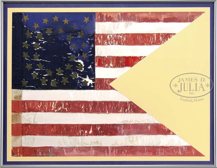 REGULATION GUIDON PENNANT OF LT. JOHN BODAMER OF THE 10TH US CAVALRY (BUFFALO SOLDIERS). This framed guidon descended in the family of John A. Bodamer who served during the Civil War in the infantry unit and later on in the 24th NY Cavalry which he served when he was captured south of Richmond, VA in August 1864 and was confined to several rebel prisons before being released in April of 1865. Bodamer, after the war saw service in 1867-1870 as an officer with the 10th US Cavalry which we now know as the famous “Buffalo Soldiers” made up of freed slaves. Though this flag could have been used during the Civil War it is more then likely a relic of his time out west with the Buffalo Soldiers fighting the Indians. There were so many surplus cavalry guidon flags that were made during the Civil War; these flags were continued to be issued and used throughout the Indian Wars, a new pattern was not adopted until 1881. There are several letters of provenance, when this flag was originally offered along with some original photographs and a diary which according to letters is now institutionalized at the Clements Library at the University of Michigan. This flag is framed and conserved and measures 35″ on fly x 25″ h. CONDITION: Silk in this flag has seen much deterioration, most all of the white silk has deteriorated other than portions of four stripes. The most complete stripe being the bottom white stripe, which is possibly 30-40% intact. White silk in this era was generally bleached and decomposition is quite common. The red silk stripes are over 50% complete. The linen hoist is complete and most of the red and blue silk attached is present. The white silk is present in pieces only on the hoist. Ten of the stars are missing. The conservator who mounted this flag has painted over the white silk and has put backing colors where blue and red were missing. 4-41836 JS31 (6,000-8,000)