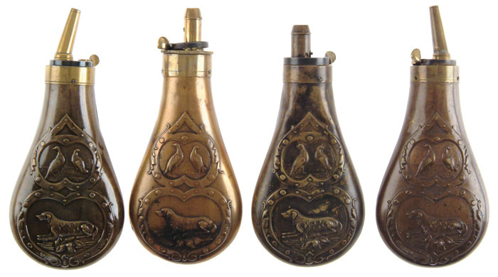 LOT OF FOUR REMINGTON POWDER FLASKS. 1) Pistol powder flask, Ray Riling Flask Book #884. 5” dog & pheasant flask with 3-position spout and the design on both sides. 2) Pistol powder flask, Ray Riling Flask Book #884. 5-1/4” dog & pheasant flask with knurled screw top design on only one side. 3) Pistol powder flask, slant charger, Ray Riling Flask Book #842. 5” flask with design on both sides. 4) Pistol powder flask, slant charger, Ray Riling Flask Book #842. 5” flask with design on both sides. CONDITION: 1) Dark patina overall with minor dents. 2) Cleaned in the past but toning well. Slight dents & seam repairs. 3) Excellent with 60% orig finish. Slight wear at high points & one shallow dent. 4) Dark patina with new coat of varnish. 4-59477 JH71 (1,500-2,000)