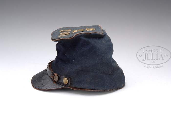 FABULOUS CIVIL WAR FORAGE CAP OF SGT. A. W. BURRELL, 107TH NY VOLUNTEERS. So rare is it to find original Civil War head gear with original insignia. The insignia on this hat “K 107″ which represents Company K 107th NY has been individually sewn into place on kepi. Company letters with small holes for sewing are quite commonly battlefield excavated, but this is the first hat that we have seen these on. Another extremely rare feature of this hat is the patented vent which is also attached to crown of this hat, here again, this patent device is commonly excavated in Union winter camps of the winter of 1862-1863 and battlefields after that date. Accompanying this forage cap is a photograph of Sgt. Burrell in civilian dress along with a tag which states that this is his hat and he died in a Philadelphia hospital during the Civil War. The 107th NY was organized in Elmira, NY and saw service in every major battle, the army of the Potomac saw. The 107th NY saw heavy action in Antietam in the September of 1862; Sgt. Burrell became ill in Oct. 1862 and was sent to the hospital in PA where he later died in Jan. 1863 of Typhoid fever. Sgt Burrell’s forage cap is in wonderful condition. The body of the hat exhibits several small areas of mothing, the largest being 1″ x 1/4” which does not detract from the overall aesthetics of this beautiful hat. The insignia and vent are near perfect with only one loop of thread in the “0” torn, which allows the zero to move and show light fading shadow. The blue color of the hat has faded to a rich patinaed blue/gray as can be seen in photos. the hat is intact and complete including tarred brim, tarred chin strap, brown cotton lining and 1-3/4″ sweat band which exhibits a few areas of insect damage about 1/2 of the length of the sweat band has been resewn to hold it in place. The lining is loose in areas, but appears to be mostly intact. You are bidding on an exquisite, original and authentic hat which has few peers in the private marketplace. Additional photographs of lining, interior and associated tags are available upon request. PROVENANCE: Family Estate. CONDITION: As stated above. 4-37756 JS22 (12,000-15,000)