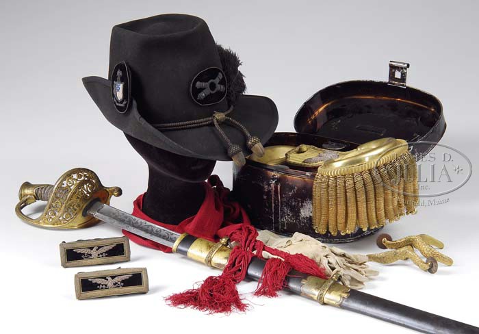 OFFICER’S SWORD, OFFICER’S SLOUCH HAT, AND OTHER EFFECTS OF COL. JOSHUA M. VARIAN. This is an interesting and fine grouping of items belonging to Col. Joshua M. Varian who served in the New York 8th National Guard, which included Varian’s Light Artillery Company of which Joshua Varian was originally Capt. and later Col. Varian’s New York State Militia Light Artillery Company was the artillery company of the 8th New York Militia Infantry. This regiment in pre-Civil War days was known as the Washington Grays. The artillery company, in turn, was nicknamed the First Troop Washington Grays. This designation was dropped at the start of the war when their uniforms were changed to conform to the federal Blue. All of the unit’s members were from New York City and most of the officer cadre were from well to do families. The unit was called to active duty three times from 1861 to 1863. The first time was April 19, 1861 for a period of 90 days. During this period the company was known as Joshua M. Varian’s Artillery and also Varian’s Battery. This unit was involved in the First Battle of Manassas. After the First Battle of Manassas in August 1861, Varian’s Battery was disbanded, Varian was subsequently promoted to Colonel and attached to the staff of the 8th National Guard. The 8th National Guard saw service in defense of Washington DC. During Lee’s invasion into Pennsylvania the 8th National Guard saw action in small engagements near Shippenburg, PA, June 23, 1863, Sporting Hill, PA, June 30, 1863, and Carlisle, PA, July 1, 1863. This grouping consists of a model 1850 Ames Staff and Field Officer’s sword. Sword is maker marked “Ames Mfg. Co., Chicopee, Mass”. Blade exhibits 20″ etched panels with typical patriotic motifs. Blade is gray/black with scattered staining and pitting. Blade retains some original frost. Shark skin grip is intact though worn through at high places. Typical crack is visible where shark skin has separated, wire wrap is complete. Scabbard mounts and hilt retain about half of their original gilting. Officer’s slouch hat has a 3/8″ sewn edge. Hat retains an orig feather and button rosette sewn directly to hat. 3″ embroidered artillery insignia decorates front of hat. In place of Jeff Davis hat pin is a New York State seal device, also embroidered in bullion. Both hat insignias are correct for the era with metal backs. The New York State seal devise is missing the upper loop and directly sewn to hat. Officer’s hat band is retained. Sweatband is missing, though stitching mostly remains. Since Varian was in the Artillery just a short time we can guess this was his hat used at First Manassas is in beautiful condition, showing little wear and minor damage to sewn edge and insignia. This officer’s “Burnside” or slouch hat would fit nicely into the most advanced Civil War headgear collection. Also included in this group is a fine pair of Patent Eagle Head boxlock spurs. Locking devices are marked “Sheldon”. Spurs have iron rowels and heavily gilted with the majority of the gilt remaining. There is a cased pair of Colonel epaulets. Epaulets are in very good condition with silver eagle embroidered devices. Stitching coming loose on back of left epaulet, otherwise very good. There is also a pair of tie down Colonel straps about 4″ x 1-3/8″. These shoulder straps have embroidered silver eagles on black velvet background which would be correct for Col. Varian being a Colonel of Staff. A red silk Officer’s sash which is about 8′ long is also included. This style of sash is generally thought of being pre-Civil War without the heavy knots of Civil War sashes with simpler silk tassels. There are also two pairs of kid gloves, possibly for dress use. Gloves like these are rarely seen in military groupings. CONDITION: As noted above. 4-35318 JS1408 (20,000-30,000)
