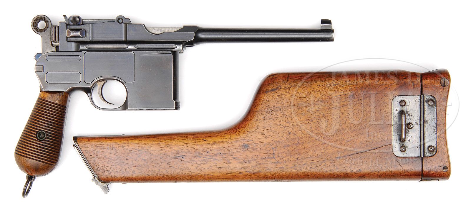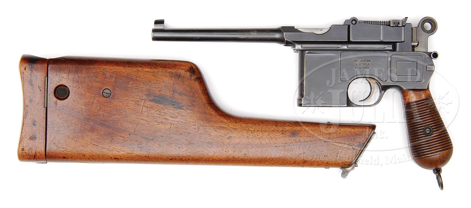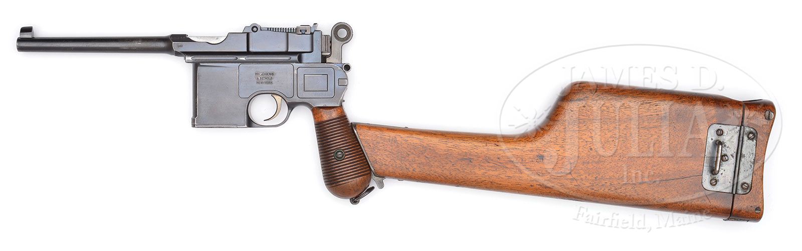 *EXCEPTIONAL MAUSER C96 EARLY LARGE RING, EARLY SHALLOW MILLED, VL&D, WITH MATCHING STOCK. SN 30457. Cal. 7.63mm. Very attractive Large Ring, Shallow Milled C96 with 5-1/2″ bbl, long extractor, slip-in 50-1000 rear sight and single lug firing pin. Standard markings on chamber with full SN on left chamber flat. Crown “U” on left side of bbl extension and antler proof on right side. Matching number on bolt stop, sight assembly, bolt, firing pin, hammer, subframe, locking lever and frame. “Von Lengerke & Detmold New-York” on right frame. No Mauser markings on right frame. Detailed disassembly shows matching follower and floorplate, in addition to locking block and all subframe components. Wood grips with full SN stamped on inside each grip panel. Lanyard ring is present. Production of this variation was only about 3,000 pistols. Accompanied by matching shoulder stock. PROVENANCE: Ralph Merrill Collection CONDITION: Pistol has 70-80% original rust blue with uniform thinning and fading over most of the gun. Little blue remains on the frontstrap, backstrap is worn where contacted by the stock lug. Trigger with 80% original straw. Small parts with about 90% original fire blue. Bore with very good rifling with frosting. Worn stock with multiple cracks in body and lid. Hairline cracks in body radiate from opening with the longest about 3″. Lid has been broken in half and repaired with two screws and glue. Another small section, corresponding to the large ring cut-out, has nearly broken out. 95% original blue on hinge. Lug with full matching number has faded to gray. (C&R). 4-47226 LMA87 (2,500-5,000)