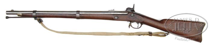 CONFEDERATE RICHMOND CARBINE. Richmond Carbines, depending on the reference, were not made until late 1863 or 1864. Earlier parts often show up on these guns as battlefield-gleaned bbls & locks were used. This bbl conforms to the typical configuration found, having a 25″ .58 cal bbl with the unique wide pinched front sight only seen on Richmond arms. These guns uniquely used 3 sling swivels, one on front band, one on trigger guard and one in buttstock. This gun exhibits all three. Forestock is held by two bands, which are the same as the rear and middle band as a standard 3-band rifled musket. Nosecap & buttplate are of brass, correctly marked on lock forward of hammer is “C.S. / RICHMOND VA” and at the tail is dated 1863. This gun has soldier’s initials and “1863” carved in stock as can be seen in pictures. These guns saw hard use. This gun is no exception but it appears orig & authentic and retains an orig Confederate canvas sling. CONDITION: Bbl is cleaned and gray overall with pitting, especially at breech. VP proof still visible on bbl but not bbl date. Buttplate & nosecap are well fit, though nosecap has been cleaned, both exhibit good patina. Bbl bands are gray & smooth overall and are loosely fit being possibly replacements. Rear sight is correct style but appears replaced as does ramrod. There is discernible rifling in bore though it is faint from much use. Stock is sound with good red color and two sets of initials and date carved on either side. There is a 4-1/2″ glued repair to stock in front of lock as can be seen in photos. The rear sling swivel appears correct but has been reseated into mortise in wood and base sits about 1/4″ below surface of stock. 4-45795 JS43 (4,000-6,000)