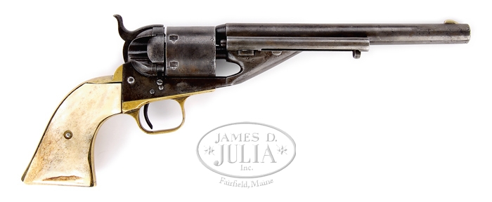 COLT MODEL 1861 NAVY CONVERSION REVOLVER SN 2717. Cal. 38 CF. Usual configuration with 7 7/16″ round bbl, having been re-crowned during period of use. It has German silver front sight with “New York U.S. America” address with 2-line patent dates on left front of frame. It has brass trigger guard and backstrap with stag grips. The bbl has Richards Mason type ejector rod housing with bullseye, half-moon, ejector rod head with Richards-Mason style conversion plate and loading gate that has the exposed flat tension spring and screw. The cylinder has double numbers on the side with the lower set matching the frame. The back of the cylinder also has a matching set of numbers. According to Flayderman’s Guide to American Firearms, only about 2,200 of these conversions were ever made in the period of the mid-1870s. CONDITION: Good, all matching except the wedge which is unnumbered. Overall retains a cleaned light gray-brown patina with clear markings. The grip frame retains a medium mustard patina. The cylinder is a smooth gray patina and retains about 30% Ormsby naval battle scene with some pitting around the front edge. The grips do not fit particularly well but are sound and have a nice aged patina. Mechanics are fine, strong bright bore with scattered pitting. 4-33638 JR372 (2,500-4,000)