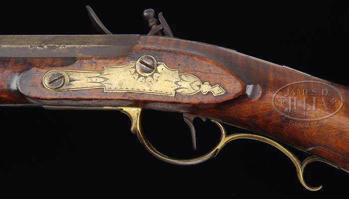 UNSIGNED FLINTLOCK KENTUCKY RIFLE ATTRIBUTED TO PETER KUNTZ. SN NSN. 50 Cal. rifled 40 3/4″ full octagon unsigned barrel with an unusual brass engraved rear sight. The stock is curly maple with no evidence of any repairs or restoration. The four-piece engraved brass patchbox has one piercing and is in the style of those used by Peter Kuntz of North Whitehall Township, Lehigh County, PA. Peter is the brother of the famous Philadelphia gunsmith Jacob Kuntz. The brass-engraved sideplate and very attractive brass and silver inlay cheekpiece are typical of Kuntz’s fine workmanship. The trigger guard features a brass stud forward of the bow typical of Lehigh/Northampton school rifles. The nosecap is grooved for the ramrod,again proper for the school. The London warranted flintlock appears to be original flint and is correct for the rifle. Kuntz guns are highly sought after by collectors. CONDITION: Rifle shows signs of use with normal dents and dings throughout but is in generally fine condition. The patchbox release is not working and needs adjustment. It is possible the patchbox door may be an early replacement. 4-37388 RGG2 (12,000-16,000)