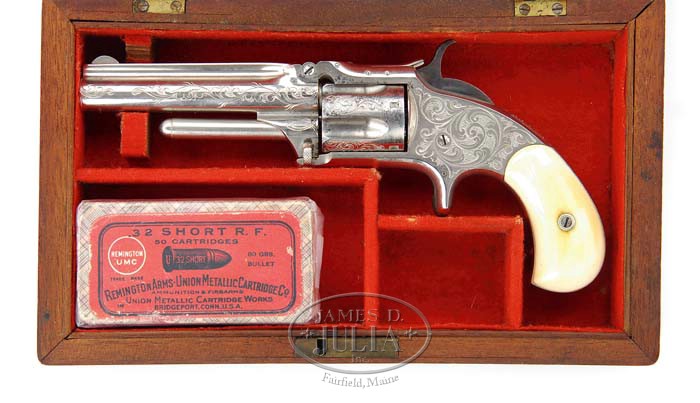 CASED ENGRAVED & INSCRIBED SMITH & WESSON MODEL 1-1/2 SECOND ISSUE NEW MODEL SPUR TRIGGER REVOLVER. SN 84992. Cal. 32 RF. Nickel finish with 3-1/2″ keyhole shaped bbl, half moon front sight with rear sight notch in cylinder stop. It has 5-shot fluted cylinder with spur trigger & matching numbered smooth ivory birdshead grips. Frame, cylinder & bbl are beautifully New York engraved from Nimschke shop, possibly by the master himself, with about 50% coverage sweeping foliate arabesque patterns with very fine punch dot background. Engraving extends up sides of bbls with a small flourish on each side of muzzle & on lands between flutes of cylinder. Back strap is inscribed in period script “Joseph Stickney” and top of back strap has a rectangular pattern of diamonds & dots. Accompanied by an orig red felt lined mahogany casing compartmented in bottom for revolver & two open compartments, one containing a full sealed box of Remington/UMC 32 Short RF cartridges. Although these revolvers were produced in large quantities, few survive in high condition and are only very rarely encountered with engraving and are almost never found with orig casing. Stickney was a wealthy Pennsylvania and New Hampshire industrialist having made his fortune in coal and being one of the founders and designers of the Pennsylvania Railroad. The famous Mt. Washington Resort at Bretton Woods, NH was the brainchild of Stickney who spared no expense in its design and construction, the project being completed and opened in 1902. At the time, it was considered the most prestigious in the world. Today, the hotel is on the Natnl. Register of Historic Places and remains one of the nation’s most luxurious vacation spots. Included with this lot is biographical information on Stickney and his wife, who, after his death in 1903, continued to run the family empire both in the US and abroad until her death many years later. PROVENANCE: Wm. J. (Bill) Maier Estate Collection. CONDITION: Very fine, all matching including grips. Overall retains 96-97% strong orig nickel finish with very fine pitting around front edge of cylinder & down one land between flutes with some corresponding very fine spots of pitting on side edges of top strap. Mechanics are crisp, bright shiny bore with scattered pitting. Case has a few minor storage mars on lid & a small crack at left rear edge with left end of top having one loose corner & another loose corner in bottom, all easily repaired. Interior of case is lightly faded with a few spots of moth damage with light soil & wear from revolver. Box of cartridges is very fine. 4-36236 (5,500-7,500)