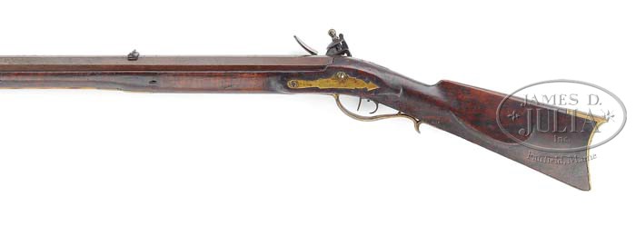 P&D MOLL HEAVY FLINTLOCK BENCH GUN. SN NSN. 64 Cal. full octagon 39 1/4″ long barrel signed P&D Moll. Peter and David Moll worked in Hellertown, PA and made guns in the flint and percussion periods. Bench guns of this type were very popular in the Lehigh, Northampton and Berks County areas of Pennsylvania in the early 19th century and were used for shooting “over the chunk” at local target ranges. This rifle has a two piece fleur-de-lis brass engraved patch box typical of the Moll style. The brass toeplate and arrow-backed sideplate are also typical of Moll’s work. The stock is correct for a P&D Moll featuring a gull-winged cheek rest and the nosecap is open-ended and grooved at the bottom for the ramrod, also correct for this rifle. The English made lock appears to be orig flint. CONDITION: The patchbox door release needs adjustment as the door will not open and the toeplate is bent at the toe where a small amount of wood is missing. The gun shows a great deal of heavy usage but has no missing parts and no major restoration. There is evidence of a wood repair to the left of the barrel tang and an extra wood screw has been added to the tang. The English flintlock could be an early replacement. 4-37384 RGG1 (2,000-3,000)