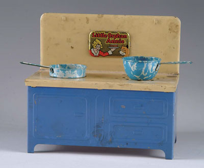 TIN TOY STOVE. Little Orphan Annie tin stove with blue graniteware pots and pans. SIZE: 8” w. CONDITION: Very good. 1-1965 (75-125) Auction: Advertising, Toy & Doll - Spring 2004 Please Note: All prices include the hammer price plus the buyer’s premium, which is paid by the buyer as part of the purchase price. The prices noted here after the auction are considered unofficial and do not become official until after the 46th day. |