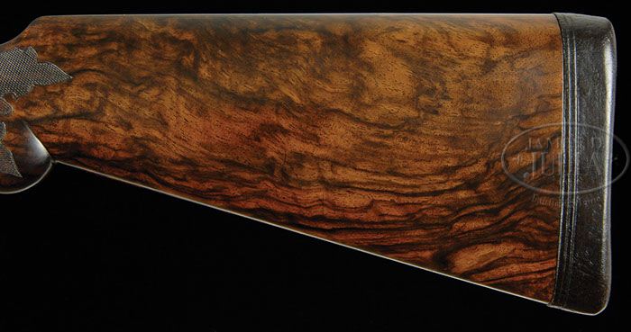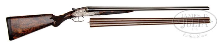 *SPLENDID W & C. SCOTT PREMIER SIDELOCK EJECTOR LIGHT GAME GUN WITH EXTRA BARRELS. SN 100642. (1914) Cal. 20 ga. 2-3/4″ Chambers. 25″ Bbls. This very fine top of the line shotgun has two sets of bbls, the original being Damascus with flat, matted rib with square crossbolt extension, engraved “W & C. Scott & Son. Makers The Premier” on top of right bbl, and with Scotts Schaftesbury Avenue address on left. Bbl flats are stamped with London nitro proofs for 1 oz of shot and long chambers. Bottoms of bbls are stamped with SN and “2-3/4″ Shell”. Newly made (London proof 2000) steel chopper lump bbls are stamped with London proofs for 70mm chambers with W & C. Scott name and address on tops. Small, round body, case hardened, sidelock action is stocked to the fences and features automatic safety, double triggers, Scott’s square crossbolt third fastener, side clips, patent gas checks, and automatic ejectors. Action is engraved with very well cut medium scroll outlining detailed vignettes of game birds and dogs, with flying goose and group of ducks on bottom; quail, snipe, and a pointer on left lock; and ducks, woodcock, and setter on right. Fences, top of action, and pivot of blued top lever are carved with very well cut and shaded semi-relief scrolled acanthus. This treatment continues up onto rib extension. “W & C Scott and Son” is on each lockplate. SN is at grip of blued trigger guard, having a pair of grouse on bow. Exceptional, beautifully marbled and nicely figured European walnut semi pistol grip, round knob, buttstock with nicely shaped drop points, measures 15″ over dark brown leather-covered pad. Borderless fleur-di-lis pattern checkering is at grip and surrounds large inlaid gold shield at top. Matching splinter ejector forend has Anson push button release. Damascus bbls: Bore diameter: left -.620, right -.620. Bore restrictions: left -.027, right -.012. Wall thickness: left -.017, right -.022. Drop at heel: 2-3/16″, drop at comb: 1-1/2″. Weight: 5 lbs. 13 oz, LOP 15″. Steel bbls: Bore diameter: left -.612, right -.612. Bore restrictions: left -.027, right -.016. Wall thickness: left -.035, right -.032. Drop at heel: 2-3/16″, drop at comb: 1-1/2″. Weight: 5 lbs. 12 oz, LOP 15″. CONDITION: Excellent, as refurbished. Damascus bbls retain nearly all of a fine brown finish with fair definition to pattern, engraving slightly washed. Exceptionally fine newly made steel bbls retain essentially all of their orig “Best” London black. Action retains traces of its orig case hardening color in protected areas, but is mostly a pleasing silver to pewter gray. Top lever and trigger guard retain nearly all of their re-blued finish, engraving of top lever appears to have been picked up. All pinheads have temper blue. Lock pin shows use. Exceptional “Best” quality (probably London made when bbls were fitted), new stocks rate excellent plus, with only a few minor handling marks in their lustrous hand rubbed oil finish. Exceptional, evenly cut checkering shows very little wear. Action is tight. Both sets of bbls are on face. Ejectors are in time. Bores are excellent. Left bbl of Damascus set shows evidence of dent being raised at bottom of left bbl. One beautiful little gun. 4-46828 MGM173 (7,500-12,500)