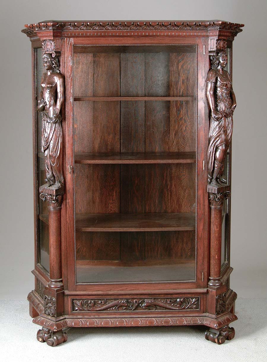 CARVED OAK CHINA CABINET. Impressive oak china cabinet starts with heavily carved feet with center cherub’s head just under a bottom carved drawer with two stylized fish. Corinthian pillars extend up from the feet on each side of the center glass door. Atop the pillars are two exquisitely carved women, one holding a ball in one hand and the other one is holding a seashell in one hand and a pitcher in the other. The top edge of the cabinet is finished with a carved molding. SIZE: 71” t x 49” w x 20” d. CONDITION: Handle on door is a replacement, otherwise very good to excellent. 5-71691 (6,000-8,000)