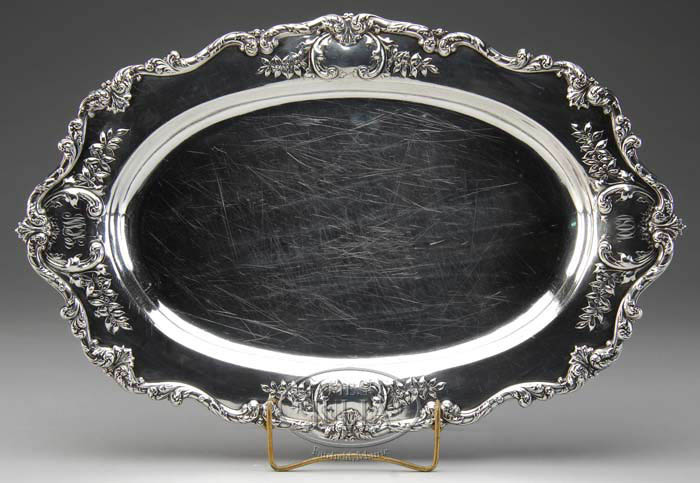 HEAVY STERLING COMMEMORATIVE PLATTER BY DOMINICK & HAFF. Bottom engraved “Cambridge, Nov. 23 1901 Harvard 22-Yale 0”. Top border with heavy leafy scroll decoration having four raised cartouches, one bearing the date “1901” and the other initials “GCW”. WEIGHT: 60 tr. oz. SIZE: 20” x 13”. CONDITION: Light knife scratches and several small dimples. Otherwise very good. 9-73855 (1,000-2,000)