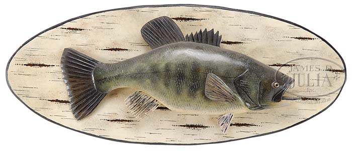 CARVED AND PAINTED 20-1/2″ SMALL MOUTH BASS BY LAWRENCE C. IRVINE, WINTHROP, ME. Signed on reverse of its natural stained oval backboard. SIZE: 28″ x 12″. CONDITION: Very good. 9-98018 (1,000-1,500)