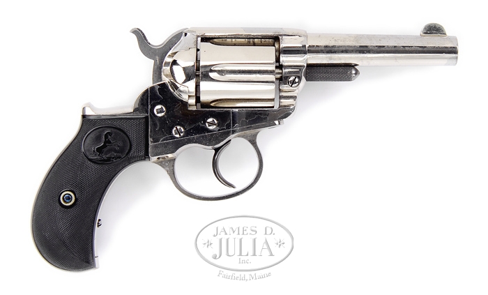 COLT MODEL 1877 DA LIGHTNING SHERIFF’S MODEL REVOLVER. SN 29261. Cal. 38 Colt. Nickel finish with 3-1/2” rnd bbl, half-moon front sight with 2-line address and etched panel on left side. Left side of frame has 3-line patent dates and it has 2-pc rampant Colt bird head hard rubber grips. Accompanied by a Colt factory letter fully identifying this revolver as having been shipped April 5, 1881 to Kinney & Co., Worcester, Mass. CONDITION: Exceptionally fine, as new. Retains virtually all of its strong nickel finish with a few streaks of minor flaking. Firing pin even has about all of its blue. Grips show very minor diamond point wear. Mechanics are fine, bright shiny bore with a few tiny spots of scattered pitting. 4-32638 JR456 (2,000-3,000)