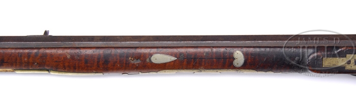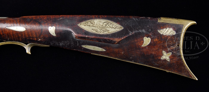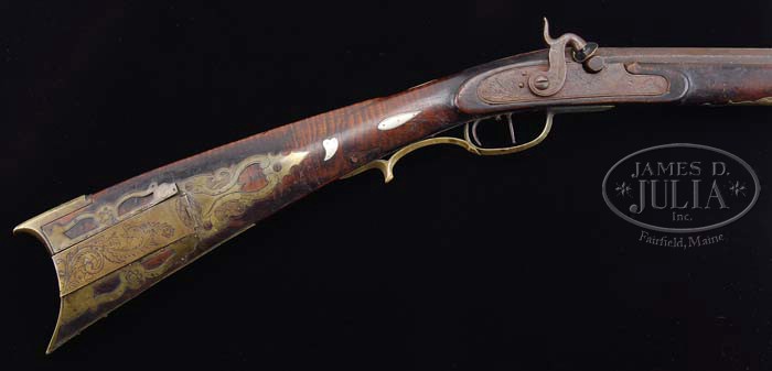 PERCUSSION HUNTINGTON COUNTY KENTUCKY RIFLE SIGNED BJK. SN NSN. 40 Cal. 41″ full octagon barrel signed BJK in script. This rifle is typical of those made in Huntington County, PA with its narrow buttstock and 20 silver inlays. The rifle has a nice 6 1/2″ brass engraved saddleplate with three piercings and a four-piece equally nice engraved patchbox with five piercings. The curly maple stock shows evidence of some light incised carving at the wrist. The silver football-shaped cheekpiece inlay is finely engraved with an eagle motif. The brass sideplate has two piercings. CONDITION: The rifle is complete and original throughout showing normal signs of hard usage. The percussion lock is heavily pitted and in need of adjustment. There is a 5/8″ by 1/8″ piece of wood missing on the cheekpiece side at the buttplate and the patchbox side panels are loose at the forward end as a number of the brass retaining nails are missing. The patchbox release is not working. 4-37382 RGG10 (2,500-3,500)