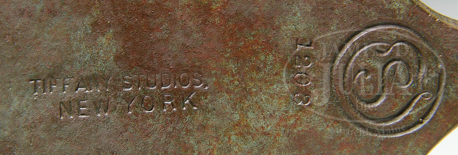 TIFFANY STUDIOS COBRA CANDLESTICK. Tiffany Studios candlestick has diamond shaped foot leading to the cobra style handle and curved arm supporting the reticulated glass candle cup. Bronze is finished in a rich brown patina with subtle green highlights. Signed on the underside “Tiffany Studios New York 1203″ and the Tiffany Studios logo. SIZE: 7-3/4” t. CONDITION: Chip to top edge of reticulated glass which is completely concealed when bobeche is in place. Otherwise very good to excellent. 5-68085 (600-800)