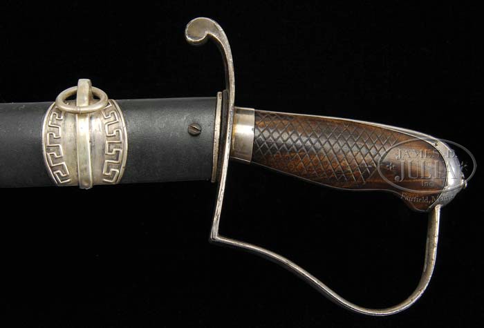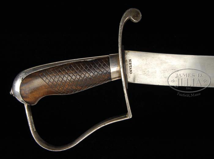 RARE MODEL 1814 N. Starr AMERICAN CAVALRY OFFICER SABER. You are bidding on one of the rarest regulation American pattern swords known. Nathan Starr was contracted to build only 31 of this pattern and no more than 2 or 3 are known to this cataloger. Harold Peterson, in his treatise on American swords,”The American Sword,” states, “Between August 3 and November 26, 1814, Nathan Starr delivered thirty-one silver plated officers’ sabers to the Commissary General of Purchases. These swords were made at the behest of officers who wanted sabers of the same general pattern as their men but of a better quality. They cost twenty dollars as opposed to eight dollars for the standard saber, and the Commissary General was reimbursed for the extra cost by the men who received them. The saber illustrated is indeed one of these very rare and special arms.. In all respects except the silver plating, the checkering of the grips and the decorative bands on the scabbard, it resembles exactly the regular issue saber made by Starr under contracts of 1812 and 1813. Since these swords were white mounted, they would also have been appropriate for field officers of infantry. “The heavy curved blade is single-edged with a clipped point and a false edge that extends back about six inches. It is stamped “N STARR” with four dots underneath on the obverse side near the hilt and “P” on the back. The grips are wood highly finished and checkered with a small pinwheel figure incised in the center of each lozenge formed by the checkering. All the metal parts of the hilt are made of iron covered with a plating of silver. These consist of a ferrule at the base of the grips; a backstrap which surmounts the grips and expands to form a cover for the rounded pommel; a knuckle-bow of the reverse P form which is pierced near the pommel for a sword knot; and a quillon which terminates above the blade in a disc. The tang of the blade is secured at the pommel by a small round nut. The scabbard is of iron, japanned black. There are two rings for suspension slings, and each of these is attached to the scabbard by bands of Sheffield plate embossed with the so-called Wall of Troy motif. There is a rudimentary drag at the tip.” This sword has been in the collections of Norm Flayderman and Donald Tharpe. SIZE: 35-1/2″ blade. PROVENANCE: Norm Flayderman and Donald Tharpe, Charles Radcliffe Collection. CONDITION: Blade is 35-1/2″ long, gray with scattered pitting and old cleaning. “N STARR” marking is well-struck. Checkered wood grip is very good with a 1/8″ x 3/8″ chip at backstrap. Sheffield plate is 95% plus complete and very good overall. Silver scabbard mounts and throat are very good overall and cleaned. Scabbard body shows light pitting under black japanning. Overall the sword is in very good condition with cleaning and and minor restoration. 4-39652 JS23 (12,000-15,000)
