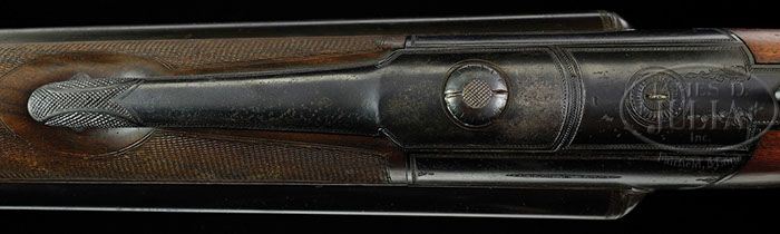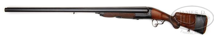 HUGE 2 BORE F. JACOB BARTELS WATERFOWLING SHOTGUN. SN 8886. Cal. 2 ga.? Approx 1.16 Bore diameter, 1.082 Muzzle diameter. 1.190 Shell base diameter. This exceptionally large, well made gun has 39″ steel bbls with concave game rib, which are engraved “Fried. Jac. Bartels.” and “Weisbaden.” on tops. Bbl flats (locking lug) are stamped “8886” and “15 Gr P85 Gr BI”. Bottoms of bbls are stamped with German imperial proofs post 1891. Sling loop is screwed and soldered to bottom rib. Massive, blued steel, Collath type tip down action with large left pivoting locking lever with checkered grasping piece, and pin type cocking indicators, has border engraving with some minor flourishes of scroll. Front projection of action is engraved “No. 8886″. This number is also stamped near pivot point. Scrolled steel trigger guard attaches to trigger plate at two points, and is basket-weave engraved. Plain European walnut semi pistol grip buttstock measures 14-1/4″ over Silver type pad and 2-1/2″ cast iron extension. Stock features nicely cut checkering with broad mullered borders at grip, and double line borders on forepiece. Stock also features large right hand cheekpiece and has sling loop on toe line. Drop at heel: 2-5/16″, drop at comb: 1-1/2″. Weight: 26 lbs. 14 oz, LOP 14-1/4”. CONDITION: Fine. Bbls retain nearly all of an older re-blue, over some light pitting, as does action. Stock appears to have most of its orig finish. Pad has crystallized and deteriorated. Bores are excellent, bright and shiny. There are some dents on top of left bbl. I’d like to say this huge gun points like a dream, but instead, it’s more like a huge crowbar. Actually it’s not bad, if you balance the action in your left palm. 4-46198 MGM31 (5,000-9,000)