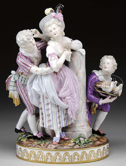 MEISSEN THREE FIGURE GROUP. Third quarter 19th to first quarter 20th century. German. Depicting courting couple wrapped in floral garland beside a column with boy dressed in purple crouching beside them with pair of doves in his hat. Incised mark “F60”, impressed number “40” with cross swords in underglaze blue. SIZE: 13″ h x 9-1/2″ l x 6-1/2″ d. CONDITION: Overall very good. Firing imperfection on gentleman’s left rear of ankle. 9-24865 (2,500-3,500)