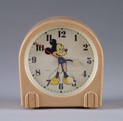 MICKEY MOUSE BAKELITE CLOCK. By US Time. Ingersoll child’s Disney alarm clock, circa 1940, art deco design. Marked © W.D.P. SIZE: 4-1/2” t. CONDITION: Wind-up runs for short periods, otherwise clean with no breaks. 1-1950 WP (100-200) Auction: Advertising, Toy & Doll - Spring 2004 Please Note: All prices include the hammer price plus the buyer’s premium, which is paid by the buyer as part of the purchase price. The prices noted here after the auction are considered unofficial and do not become official until after the 46th day. |