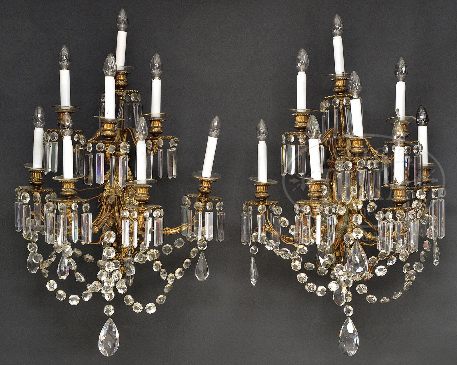 FINE PAIR OF VICTORIAN EIGHT-BRANCH WALL LIGHTS. Last quarter 19th century, American. Each sconce with a leaf-molded back plate supporting scrolling arms with three tiers of molded and fluted candle nozzles, the drip pans hung with faceted drops and prisms. SIZE: Approx 30″ h. PROVENANCE: From a fine Maine and New York private collection. CONDITION: Brass surfaces original and untouched, prisms and chains for the most part intact, some of the smaller tear drop pendants are absent. Generally very good. 9-29912 (1,200-1,800)