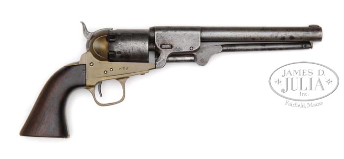 RARE CONFEDERATE GRISWOLD EARLY PRODUCTION FIRST MODEL PERCUSSION REVOLVER. SN 179. Cal. 36. Usual configuration with 7-3/8″ stepped round Dragoon-style bbl, replacement silver metal front sight and Colt style rammer with bayonet style latch and Colt style wedge, without spring. Frame, trigger guard & back strap are of brass with a large loop trigger guard and 1-pc walnut grip. Hammer is also of Colt styling, as is the cylinder,, which is 6-shots with six safety pins and six rectangular cyl stop notches with short approaches and has spiral markings around circumference. The SN was observed on bottom of bbl lug, frame, trigger guard, butt strap and cylinder. Last two digits of SN are found on rammer handle, wedge and in red pencil in back strap channel of grip. Additionally, several of the parts, including rammer handle, wedge, trigger guard, back strap and cylinder are stamped with a cryptic “W”. Right side of frame is hand stamped “CSA”. This CSA is not seen on any other Griswold revolvers but appears to be old and possibly contemporary to the war. Also, this is the only Griswold noted with an external cryptic “W” on face of loading arm. The cryptic also occurs on the wedge along with secondary number which is only noted on a few of the earliest serial number guns by this maker. Consignor believes that this gun belonged to a member of Nathan B. Forrest’s cavalry. Griswold produced revolvers for the Confederacy from about July 1862 to Nov. 1864 when the manufacturing plant was destroyed by the advancing Union Army during Sherman’s famous march to the sea. Griswold was one of the more prolific revolver manufacturers for the Confederacy but even so their entire production was only 3,200 revolvers. They were generally of good quality and the largest of all Confederate manufacturers. PROVENANCE: Fred B. McDonald Estate Collection. CONDITION: Good, all matching as noted above. Bbl, cyl & hammer are a gray metal patina with scattered fine surface pitting. Frame, trigger guard & back strap show light to moderate wear with a few tiny nicks and retain a dark mustard patina. Grip is sound showing moderate wear and retains a dark hand worn patina. Mechanics are fine, worn dark bore. 4-41412 JR95 (15,000-20,000)