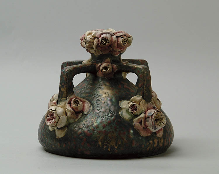 AUSTRIAN CERAMIC ROSE VASE. Lovely four-handled vase features mottled blue, brick red and gold finish with applied roses around the lip and bordering the handles where they meet the neck and the body of the vase. Mark on the bottom is nearly illegible but could be “AMPHORA, AUSTRIA”. SIZE: 9″ diameter by 8″ tall. CONDITION: Several small chips to petals of roses, otherwise very good. 5-67421 (750-1,000)