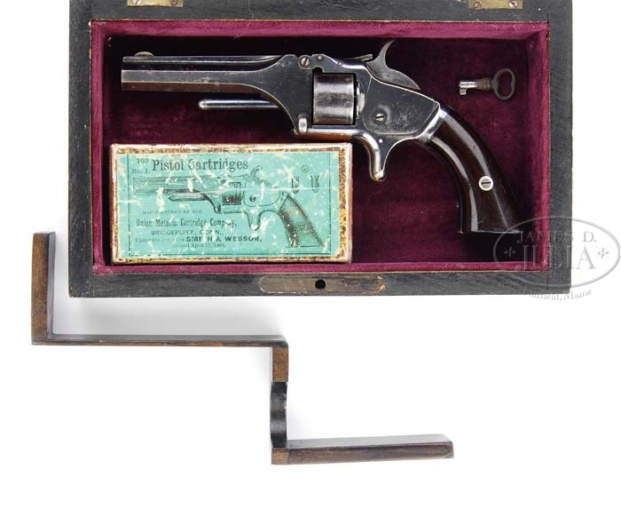 FINE CASED INSCRIBED SMITH & WESSON FIRST MODEL 2ND ISSUE TIP-UP SPUR TRIGGER REVOLVER. SN 21192. Cal. 22 Short. Blue & silver finish with 3-1/4″ keyhole shaped bbl, German silver half-moon front sight, 7-shot unfluted cyl and mounted with matching numbered 2-pc rosewood grips. Backstrap is pantograph inscribed “Orville Bassett U.S.N.”. Left side of front strap under the grip has the assembly number “H2″ which was also observed on rear face of bbl lug and front face of cyl by the cyl pin. Accompanied by a fine period rosewood veneered case, 8-1/4″ x 5″ x 1-13/16”. It has an empty rectangular plate in the lid. Inside is purple velvet lined with a removable stained wood partition creating a compartment for the revolver and a 100-pack box for UMC No. 1 pistol cartridges. Box label is green & black with a line drawing of this model revolver and has an orange band with marbled paper body. Accompanied by an orig functioning key. Orville Bassett is recorded as having been a third assistant engineer in the Union Navy 1862-1865. CONDITION: Revolver retains 92-93% glossy orig blue with loss areas flaked, not worn, to a medium patina. Cyl retains 70-75% thin orig blue, turning plum in spots. Frame & grip frame retain virtually all of their orig silver plating, oxidized to black. The only losses are on tips of spur trigger sheath and heel of grip frame. Mechanics are fine, bright shiny bore with two or three small spots of light pitting. Case has a small repair at top rear edge with grain checks in veneer on top and overall retains about all of its orig varnish. Interior is very fine. Cartridge box has worn edges with some minor chips on label. 4-39069 JR289 (1,500-2,500)