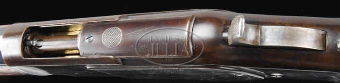 RARE FIRST MODEL 1873 WINCHESTER LEVER ACTION RIFLE. SN 9979. Cal. 44 WCF (44-40). Std grade rifle with 24-1/4″ oct bbl, full magazine, gold washed Beech’s combination front sight, short semi-buckhorn rear sight with checkered edges and a thick base tang sight with 4” staff. It has the first model mortised dust cover with impressed thumbprint. Mounted with straight grain, uncheckered American walnut with straight grip & crescent buttplate with trap containing a 4-pc orig brass & iron wiping rod. It has sgl set trigger. Accompanied by a Cody Firearms Museum letter fully identifying this rifle as found and indicating shipment 1 October 1876. CONDITION: Fine to very fine. Bbl retains about 90-92% strong orig blue and magazine tube 96-97% strong orig blue. Receiver retains about 50-60% orig blue with balance flaked to a medium patina. Lever retains traces of case colors & hammer about 90% strong colors. Wood is sound showing light handling & use marks with forearm retaining 30-40% orig finish and buttstock most of an old restored finish. Buttplate retains most of its orig case colors, somewhat faded. Mechanics are fine, strong bore with sharp rifling & light to moderate pitting. 4-32873(12,500-15,000)