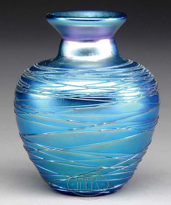 DURAND MINIATURE CABINET VASE. Adorable bulbous formed vase has a flared collar and is decorated with an applied glass threading overall. Signed “Durand 17103”. SIZE: 3″ t. CONDITION: Very good to excellent. 5-68032 (300-500)