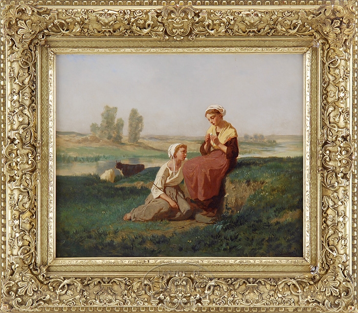 EVARISTE VITAL LUMINAIS (French, 1822-1896) IL M’AIME, IL M’AIME PAS (HE LOVES ME, HE LOVES ME NOT). Oil on canvas landscape scene shows two young sisters seated on the edge of a grassy bank. The younger sister looks up to the other who is plucking petals off a daisy. They wear traditional French country clothes. There are two cows beyond in a calm river with grass and treed land beyond. Signed lower right “V. Luminais”. Housed in a fine gesso decorated gilt frame. The canvas having a Paris canvas stamp. SIZE: 15″ x 18-1/2″. CONDITION: Light craquelure, one old patch to reverse with corresponding inpainting. Very good. 9-97022 (2,500-3,000)