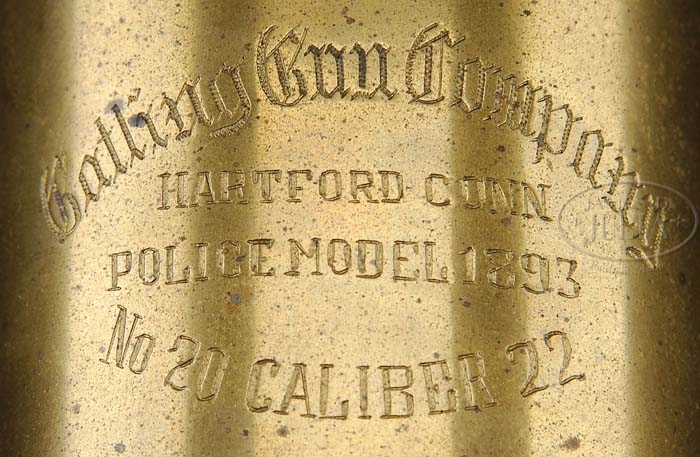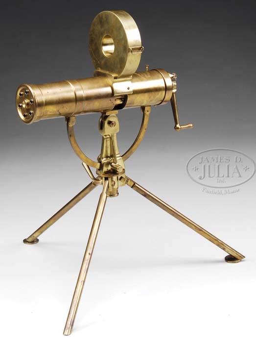 *FURR 1/4 SCALE POLICE MODEL 1893 GATLING GUN. SN 20. Cal. 22 Short. All brass construction with shrouded 6″, six-bbl cluster. It has the appearance of the Naval model with, rear crank and right hand sight. It is set up for Accles feed and comes with two matching numbered all brass Accles style drums. Mounted on a full traverse & elevation adjustable cradle which is mounted on a tripod with pad feet. One foot is missing its screw but pad is present. Top rear of gun is marked in Olde English script “Gatling Gun Company” followed by “HARTFORD CONN / POLICE MODEL 1893 NO 20 CALIBER 2”. Serial number was observed in the Accles feed opening and on the drums. CONDITION: Very fine. All parts except the aforementioned foot pad screw seem to be present and functioning properly. A fine miniature functioning firearm. 4-38417 JR373 (6,000-10,000)