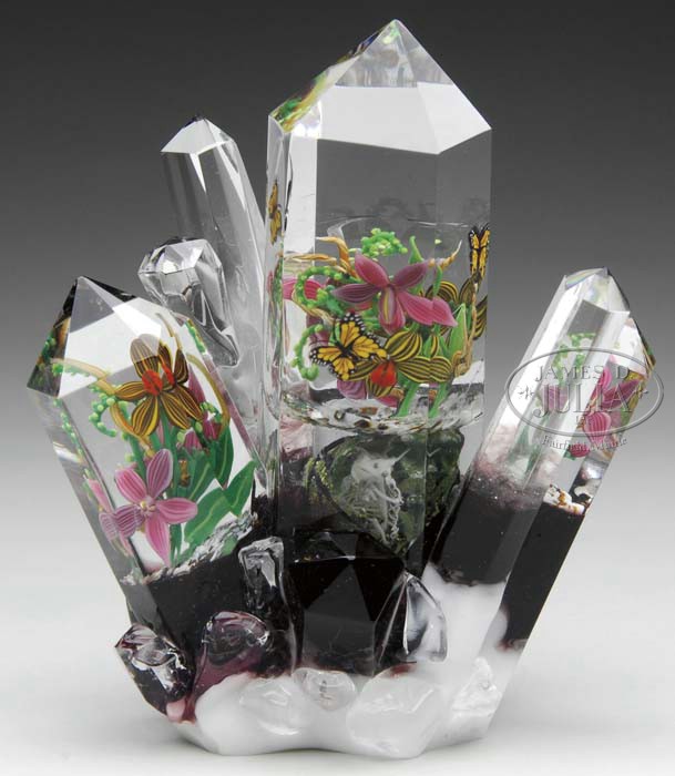 LOREN STUMP GLASS SCULPTURE. Prismatic sculpture consisting of six crystals containing three monarch butterflies, three yellow and brown striped flowers and five pink striped floral blossoms growing from a spattered earth ground. Contained within a pod under the earth ground is an animal skeleton. Signed on underside “Loren Stump 2006″ in a signature/date cane. SIZE: 7” t. PROVENANCE: Barry Schultheiss Collection. CONDITION: Very good to excellent. 5-63556 (1,000-2,000)