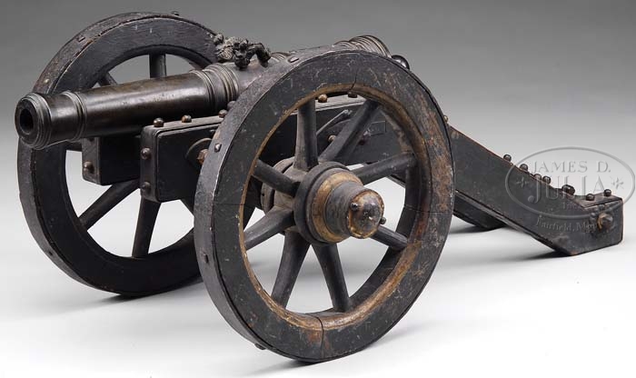 FINE 18TH CENTURY BRONZE SIGNAL OR SQUAD CANNON. Cal. About 1″. Beautiful little bronze cannon that is about 19-1/2″ overall and 2-1/4″ at muzzle x about 3-1/4″ at the base with a 1″ bore. It has 1″ trunnions and a 1-1/4″ cascable. Bbl is beautifully turned with several raised rings and dolphin-shaped handles on the top over the trunnions. Rear end of bbl is cast with a large royal crest and the date “ANNO 1743”. Surrounded by what appears to be a Latin inscription. There are two small proofs on each side adjacent to the crest. Accompanied by its orig iron bound wheeled carriage with about 12-1/2″ offset heavy spoked wheels with iron rims secured with rosehead nails. Carriage appears to be in old green paint with gold trim on wheels & hubs. Cross member bbl rest shows heavy wear. It is this cataloger’s understanding that in early English & European armies that these little cannons were frequently carried & used by individual squads of soldiers. Obviously they could also be used as a signal cannon. CONDITION: Very fine plus. Bbl retains a dark smooth blackish even patina with crisp clear markings and a crisp clear coat of arms. Carriage is sound with a few scattered worm holes and retains most of its orig green paint with gold trim having turned dark. 4-38636 JR375 (8,000-12,000)