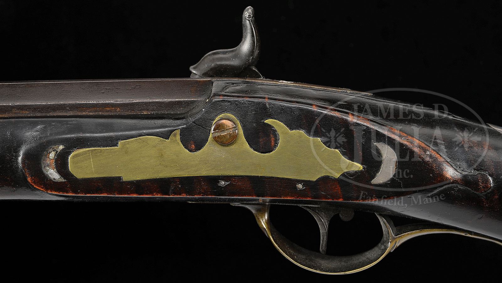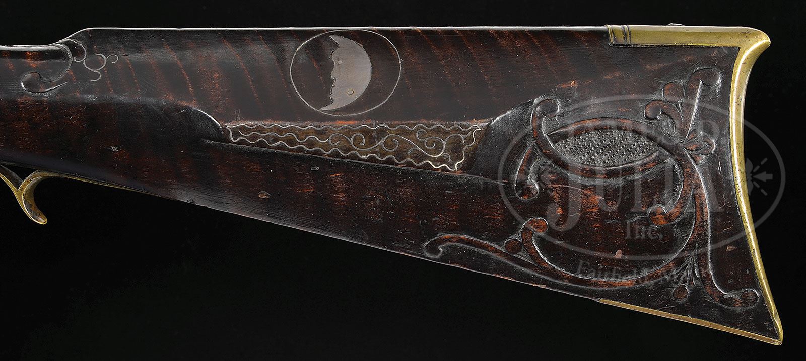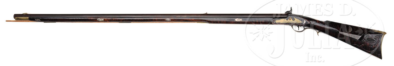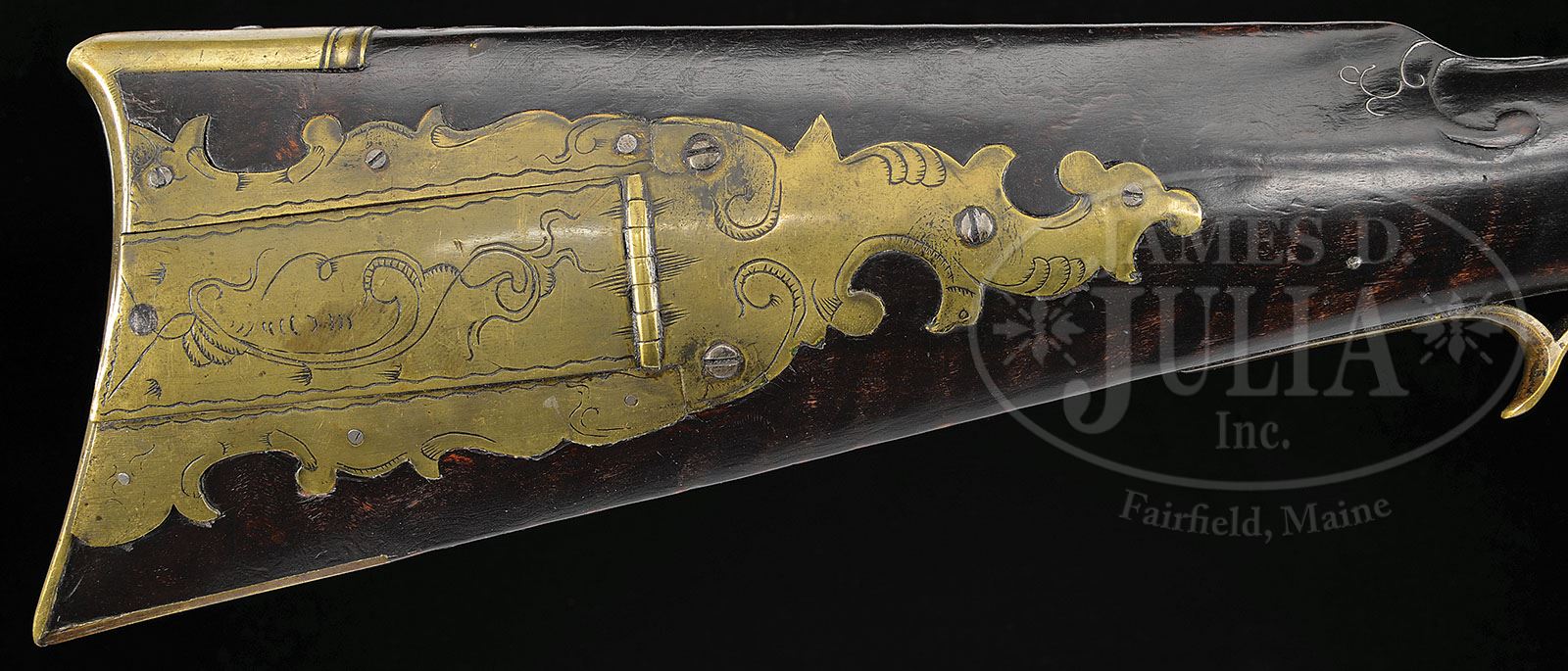 PERCUSSION RELIEF CARVED NEW ENGLAND KENTUCKY RIFLE. SN NSN. 45-1/2″ full oct 30 Cal. rifle bbl stamped “D.E.B.”. This rifle has a very nice brass engraved four piece patchbox and is decorated with C scroll relief carving filled with a basket weave design on the butt end behind the cheek. Cheekpiece is decorated with silver wire inlay and the half-moon silver inlay on the cheek inside a silver wire circle. There is relief carving at the wrist end of the comb which is also decorated with silver wire inlay. Bbl tang is surrounded by relief carving. Percussion lock plate was made by James Golcher of Philadelphia. Bbl is held to the stock by four bbl wedges each of which is surrounded by silver inlay on both sides, four of which are in the shape of fish. 3-1/2″ brass toe plate has three piercings two of which are heart-shaped. This cataloger would speculate the rifle was likely made by one of the Brown family of Cambridge, Massachusetts. CONDITION: A silver half-moon inlay forward of the sideplate is missing. 1-1/2″ wood repair with new wood on the right hand side 15″ back from the muzzle at the second bbl wedge with a small 1/2″ rectangular repair on the opposite side of the bbl. Otherwise all the forend wood appears to be original to the gun. 4-48322 RG67 (4,500-8,500)