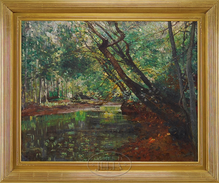 EDMUND LOUYOT (German, 1861-1909) THE WOODLAND POOL. Large oil on canvas scene shows a tranquil stream running through dense woods with sunlight penetrating the deep green foliage. Several trees are leaning over the water which is spotted with pond lilies. Signed lower right “E Louyot”. Housed in a fine modern carved and gilt wide wood frame supporting a gilt wood artist plaque. SIZE: 31-1/2″ x 39″. CONDITION: Relined on replaced stretcher, some inpainting. Very good. 9-96335 (3,000-5,000)