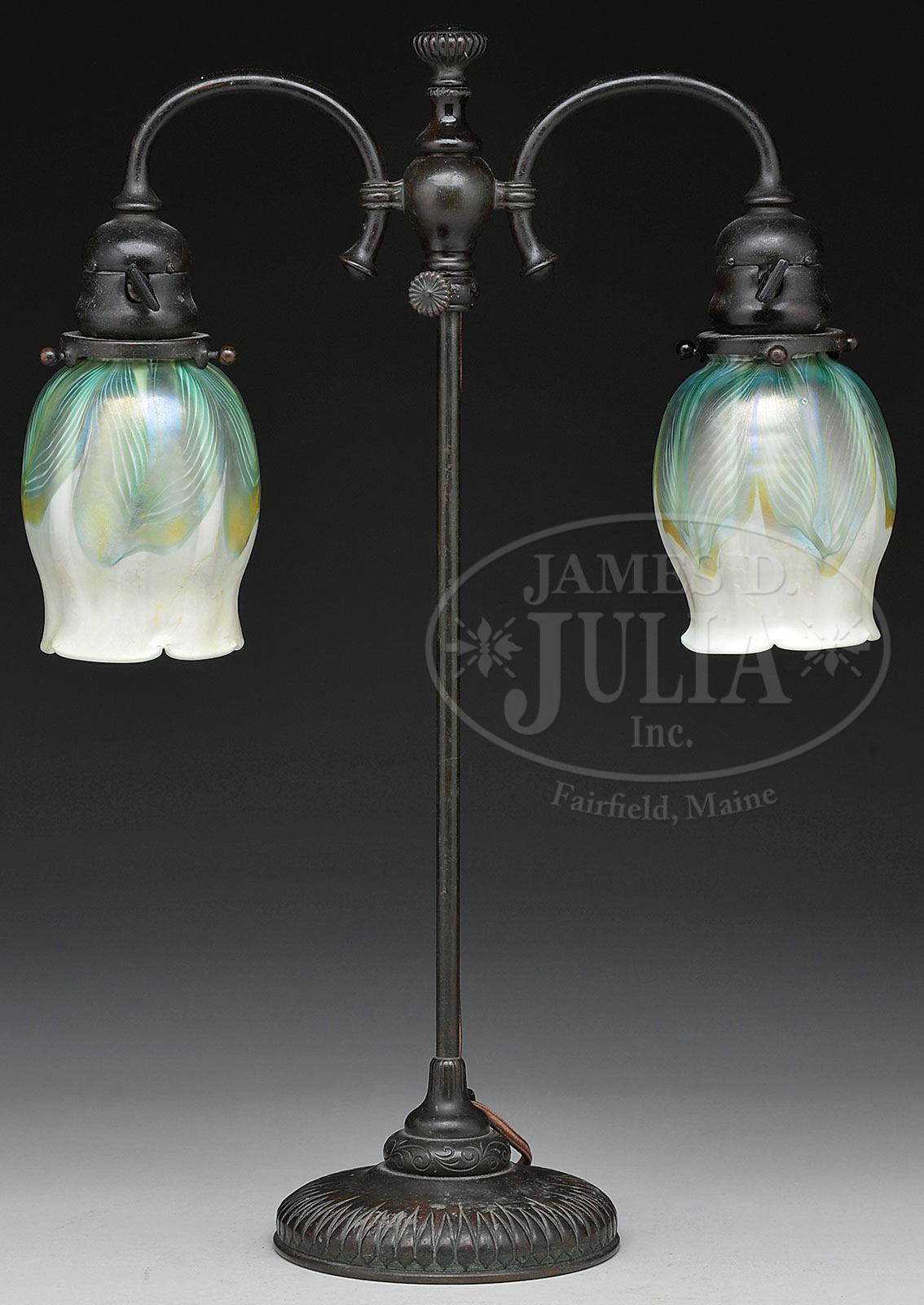 TIFFANY STUDIOS DOUBLE STUDENT LAMP. Tiffany Studios double student lamp has bronze base with zigzag decoration surrounding the foot. Adjustable base has two curved arms supporting the shades. Each tulip shade has a vertically ribbed body with green pulled feather design descending from the fitter. Each pulled feather is outlined in gold iridescence with strong blue highlights. Each shade is signed “L.C.T.”. Base is signed “Tiffany Studios New York 304”. SIZE: Lamp is 19-1/4″ t. CONDITION: Very good to excellent with some minor roughness to fitter on one shade and some minor wear to patina on base. 5-67529 (5,000-7,000)