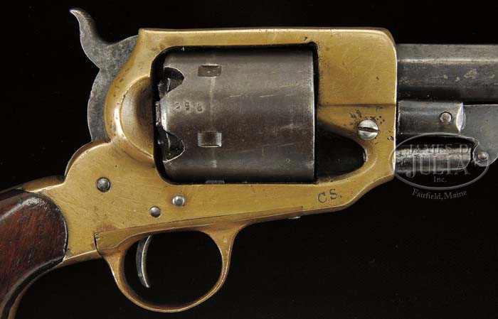 Please Note: In addition to being restored, the serial numbers were added. CONFEDERATE SPILLER & BURR REVOLVER. SN 855. Cal 36. This good looking “CS” marked brass framed Confederate revolver made in Macon, Georgia is pictured on page 89 of Matt Norman’s book “Colonel Burton’s Spiller & Burr Revolver, An Untimely Venture in Confederate Small Arms Manufacturing”. This example conforms to other examples of this scarce Confederate arm with a large “CS” stamped on right side of frame. This “CS” mark is thought to represent Confederate Government acceptance. This gun was sold at Christies in November, 1983 from famous Henry Stewart collection. Several letters of provenance accompany this gun including Ted Meredith, Matt Norman and Jim Harris. PROVENANCE: Henry Stewart, Ted Meredith, Jim Harris, Burney Crooke CONDITION: Very good as restored. Bbl, frame and triggerguard all SN 855. Loading arm is not numbered, arbor appears to be from Whitney with SN 4087. Grip frame is restored with braised and pinned brass replacements, well executed with orig old grips(probably Whitney). No markings or #s on grip frame or grips. 4-45212 JS105 (10,000-15,000)