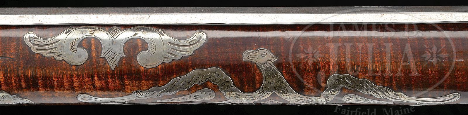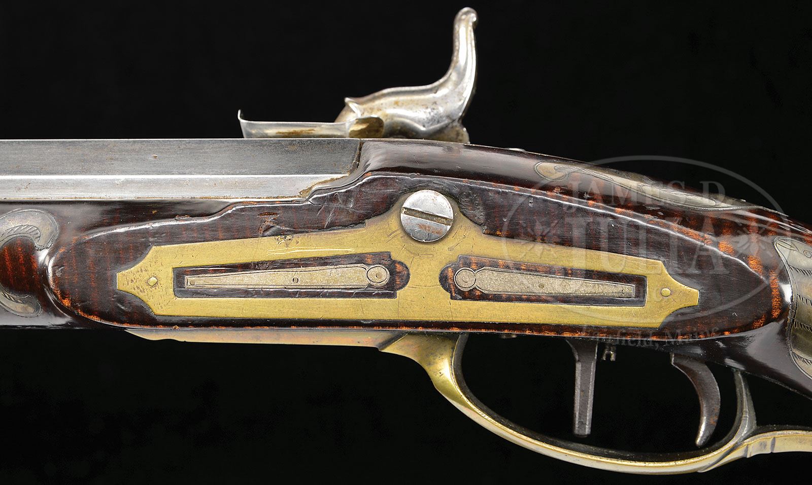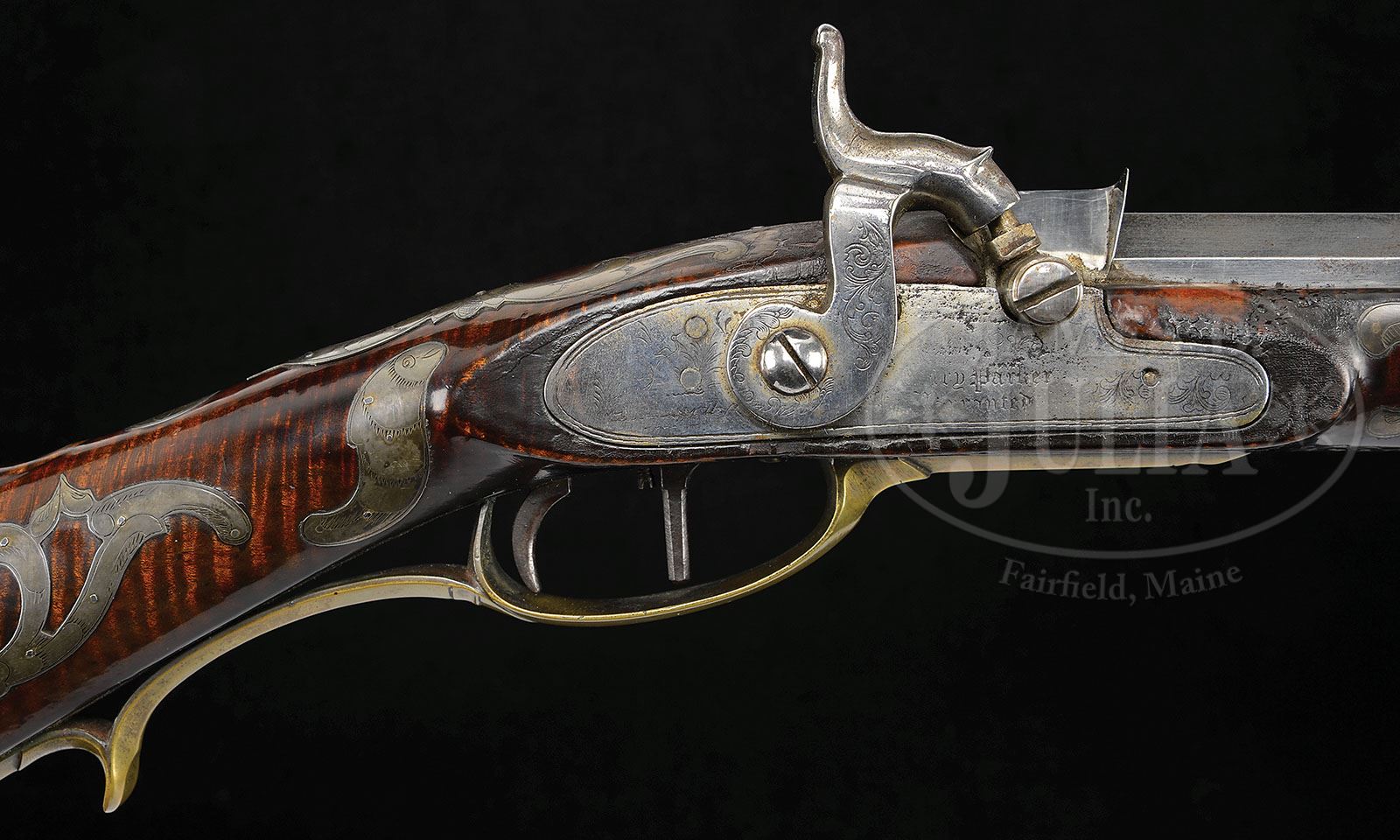 This gun is attributed to Peter Dormeyer. The last name is sometimes spelled “Dunmayer” as well. This gun is likely made by Peter Dormeyer in Bedford County. FABULOUS PROFUSELY INLAID UNMARKED RIFLE FROM THE HUNTINGDON/SOMERSET COUNTY AREA. SN NSN. 41″ full oct unmarked 36 Cal. rifled bbl. This rifle has an outstanding four piece engraved patchbox with 14 piercings. Rifle is handsomely decorated with thirty-two silver inlays and an intricate silver inlay around the bbl tang as well as a large oval silver inlay on the cheek engraved with the American eagle. There is a finely made 5-1/2″ silver American eagle as a saddleplate which encompasses three of the silver inlays. Stock on this gun is curly maple and appears to have all of the original finish with some incise carving on each side of the rear ramrod entrance ferrule and with paneling running the full length of the forestock and breaking for each silver inlay. Brass sideplate has two piercings each of which encompasses a silver inlay. Percussion lock is signed “Henry Parker Warranted” for its Trenton, NJ maker. The brass ramrod pipes are 2-1/2″ in length with a entrance pipe running 4-1/4″. An outstandingly beautiful gun. CONDITION: Fabulous original condition. Small amount of the original stock varnish has been burned away along the bbl at the breech from ignition. Elaborate silver inlay on the butt behind the cheekpiece has two silver wire nails missing that should be replaced. Otherwise this gun is excellent. 4-49150 RG79 (3,500-6,500)