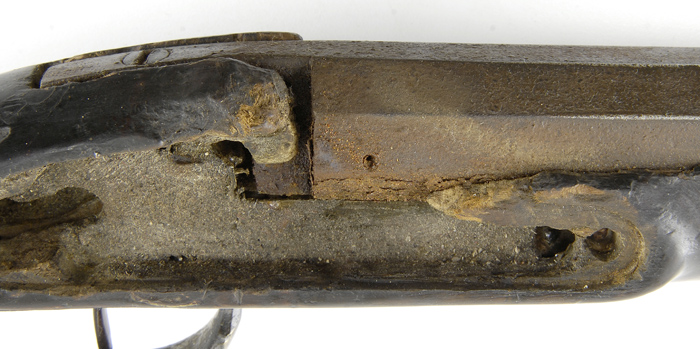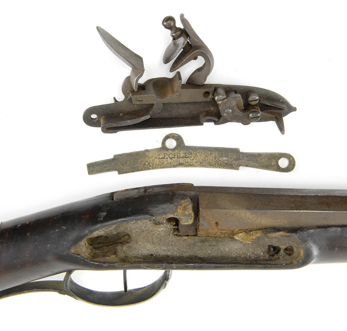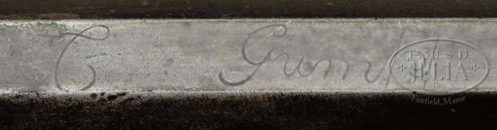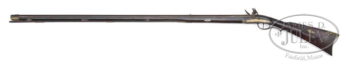 FINE CHRISTIAN GUMPF SIGNED LANCASTER COUNTY FLINTLOCK RIFLE. SN NSN. Christian Gumpf worked in Lancaster Pa. circa 1802-1843. This 45-1/2” full oct .52 Cal. rifled bbl is signed in script “C. Gumpf”. The rifle has an orig flint Dreppert Lancaster lock. The 4-pc brass patchoox is engraved and there is a 1-3/4” oval copper inlay on the cheek. Sideplate is of the typical Lancaster style and is marked inside by “H. Lecher”, another Lancaster gunsmith. CONDITION: There is a small crack in the stock on the left hand side from the middle ramrod ferrule to the bbl along with several minor age and shrinkage related cracks throughout. 4-42532 RG13 (7,000-9,000)